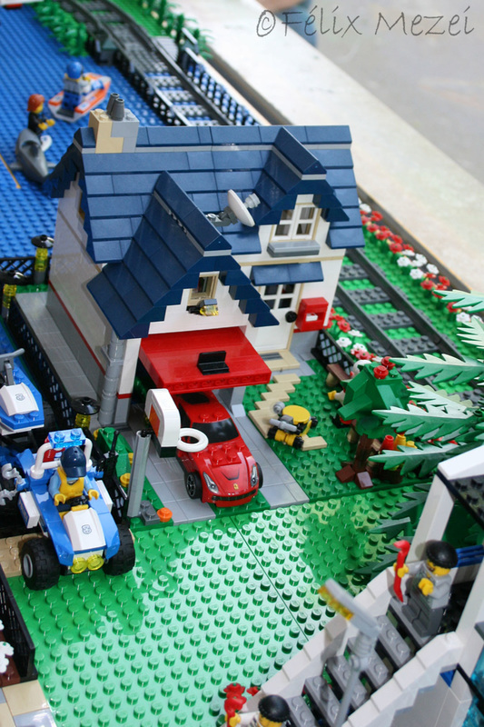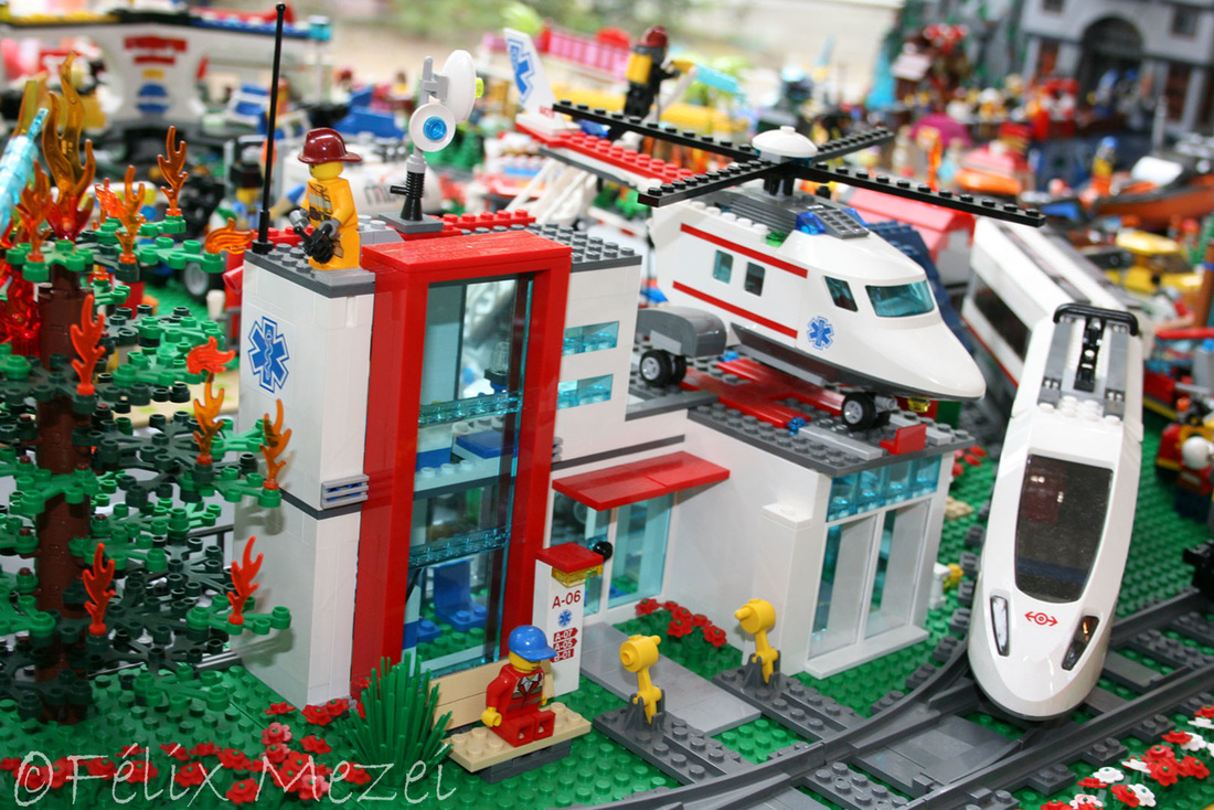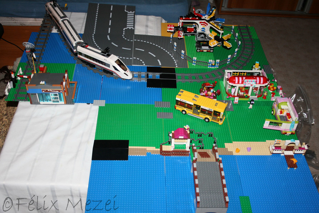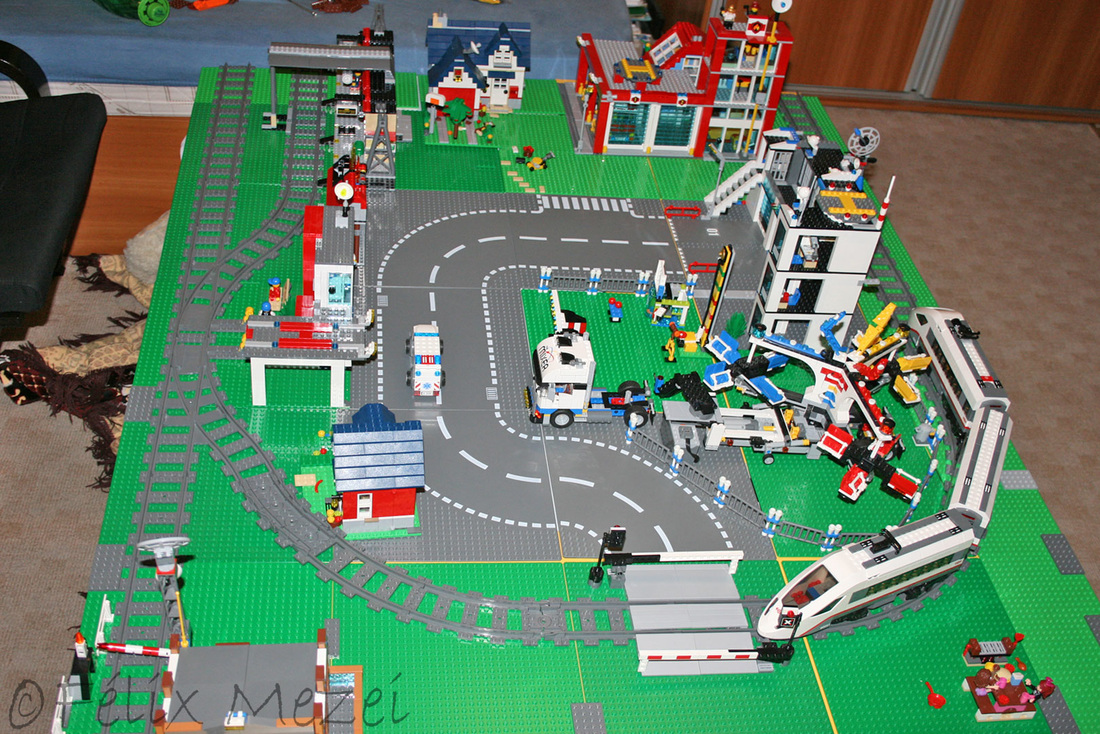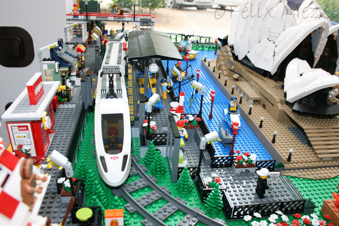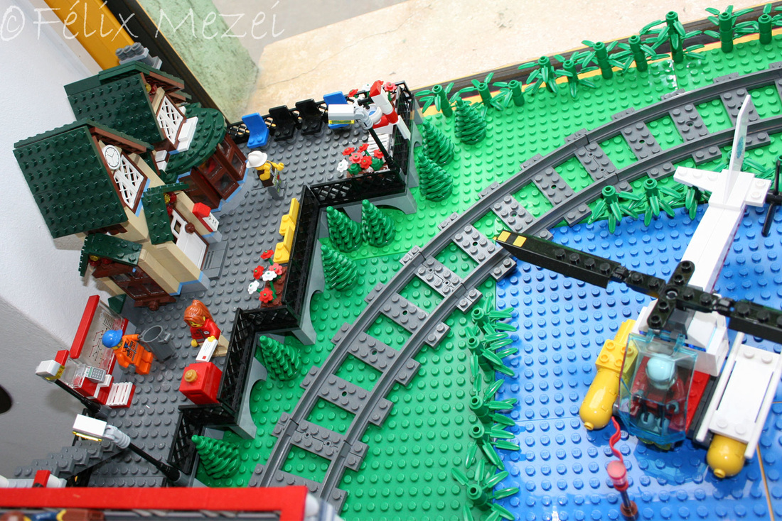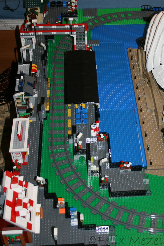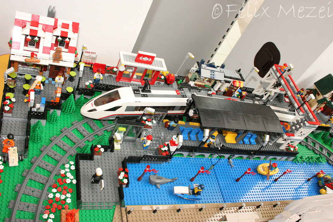 The Town comprises a personal creation of a train station, an official LEGO set train station, a city centre with the police station, fire department, hospital, four different houses, a fun-playground area and a campsite by the beach. All of these are crossed by a motorized bullet-train.