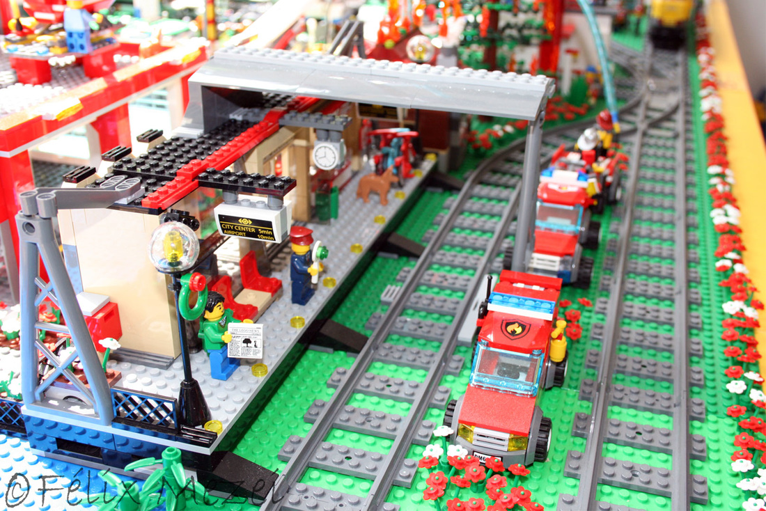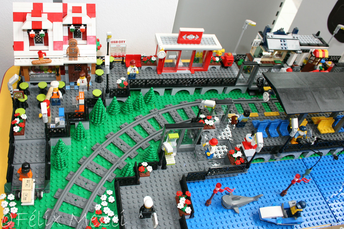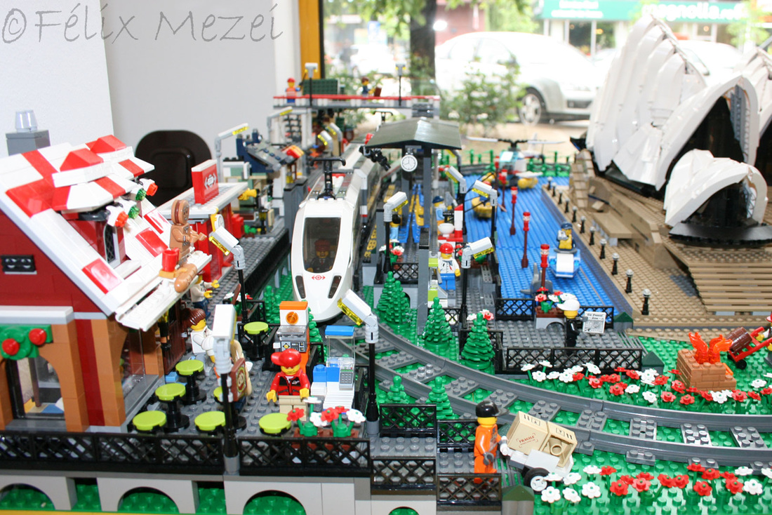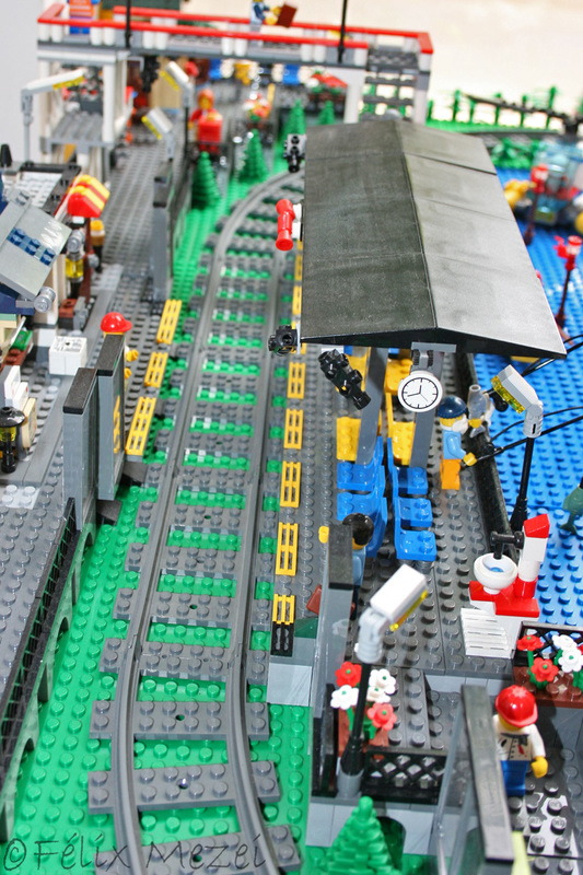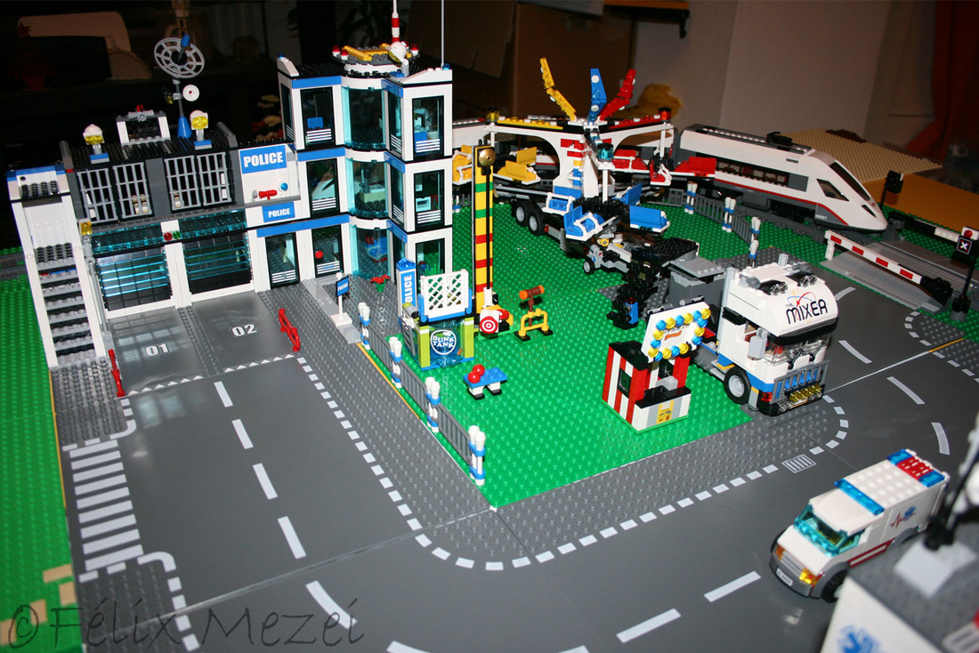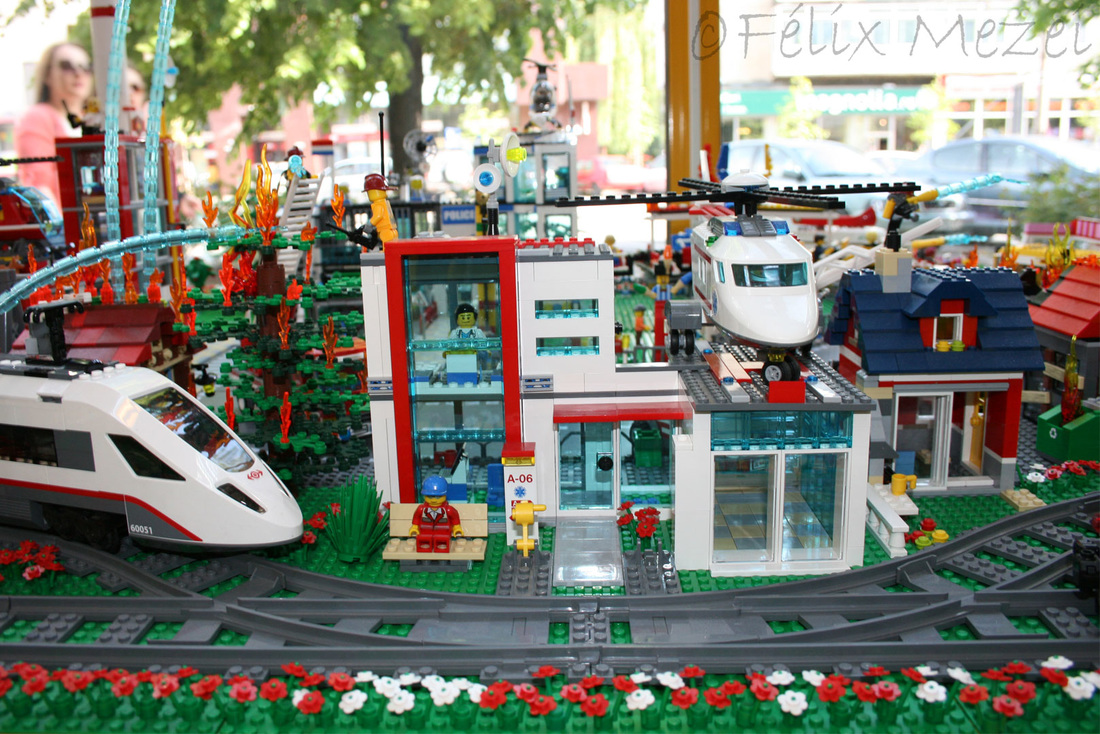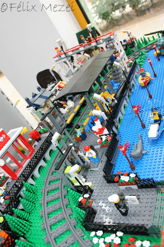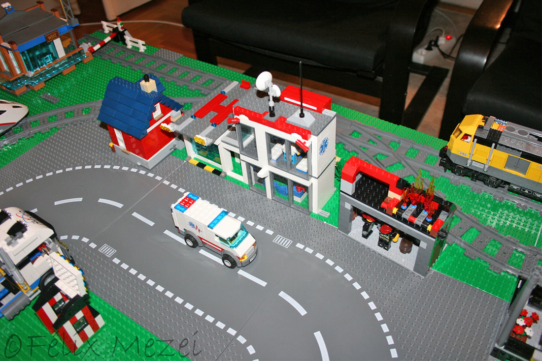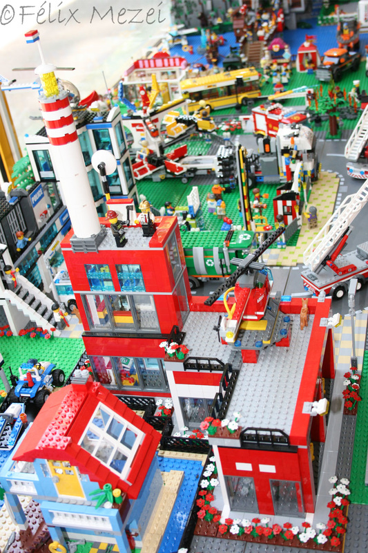 The Town comprises a personal creation of a train station, an official LEGO set train station, a city centre with the police station, fire department, hospital, four different houses, a fun-playground area and a campsite by the beach. All of these are crossed by a motorized bullet-train.