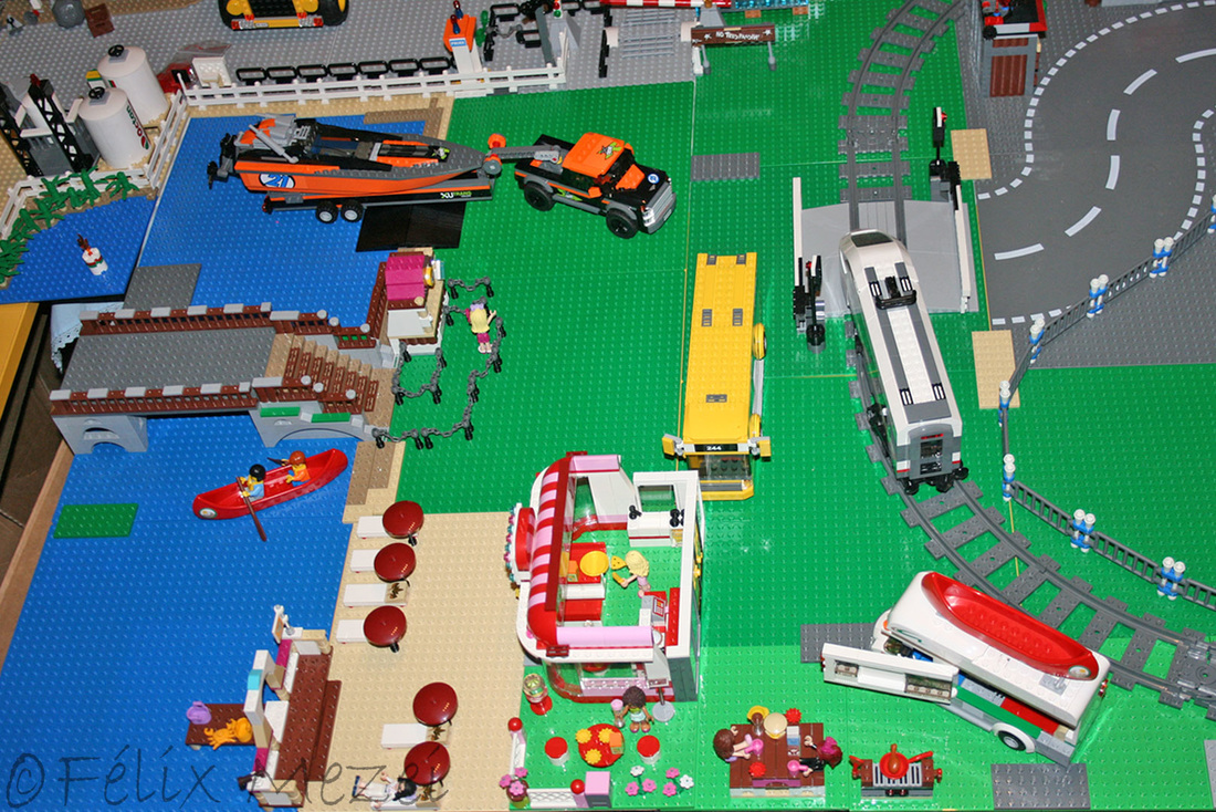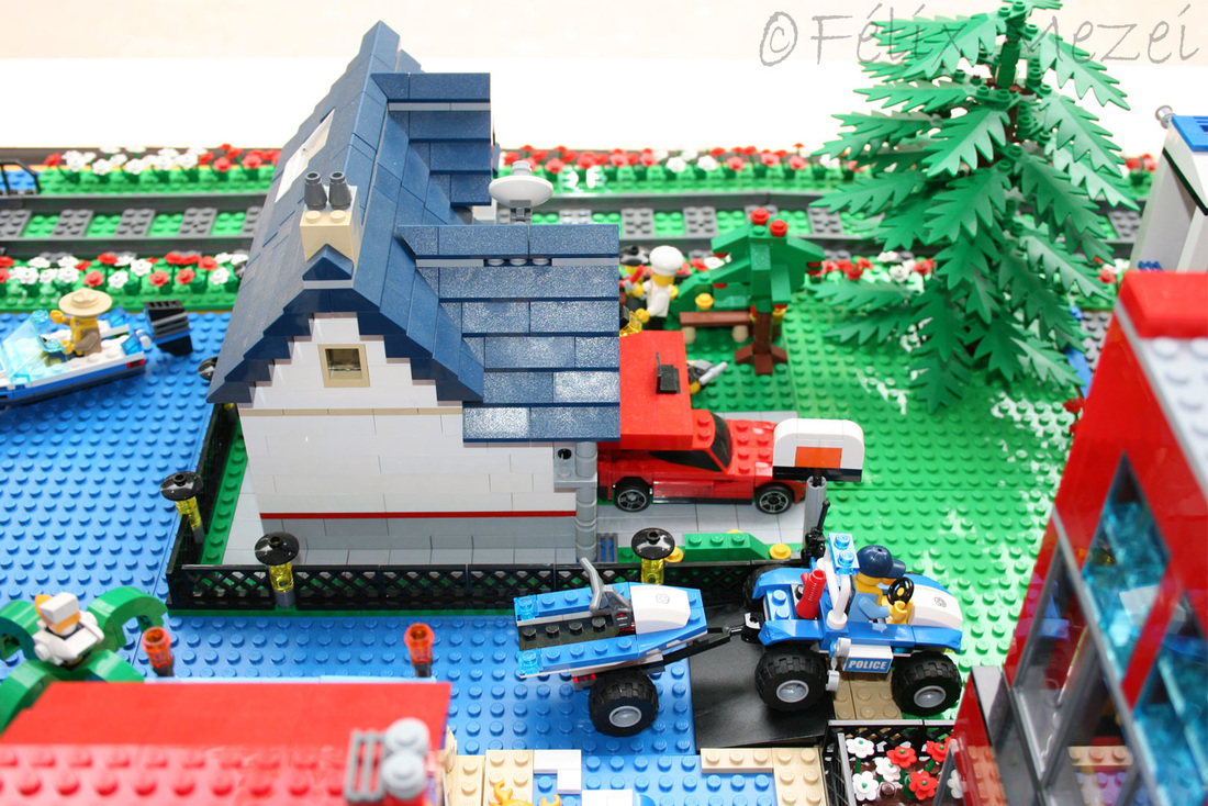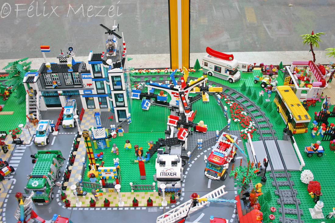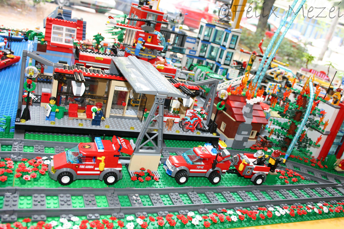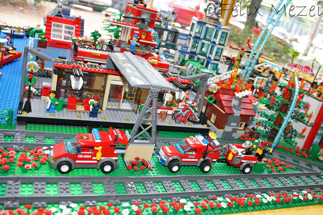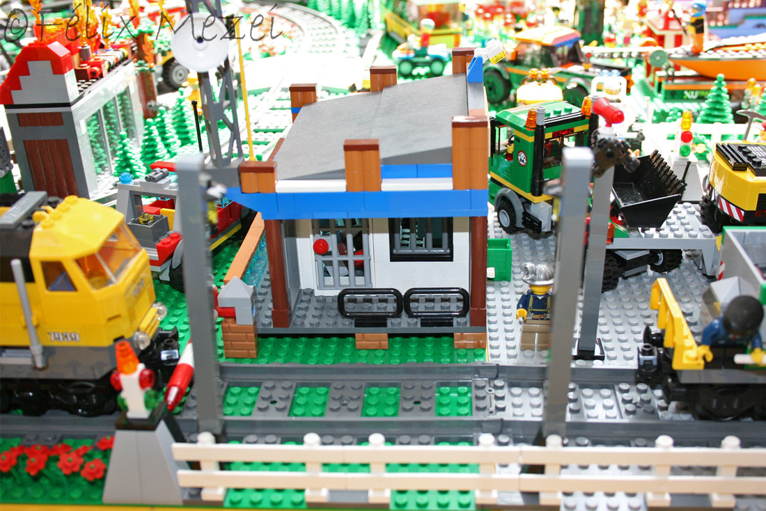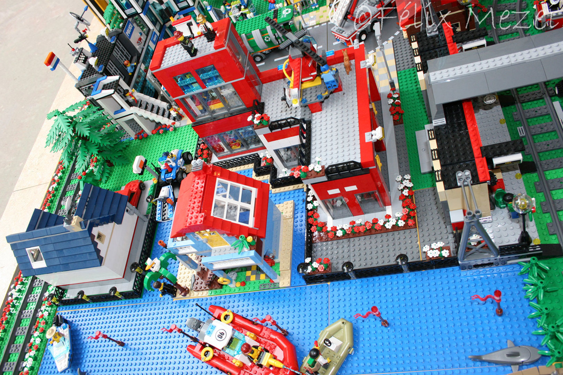 The Town comprises a personal creation of a train station, an official LEGO set train station, a city centre with the police station, fire department, hospital, four different houses, a fun-playground area and a campsite by the beach. All of these are crossed by a motorized bullet-train.