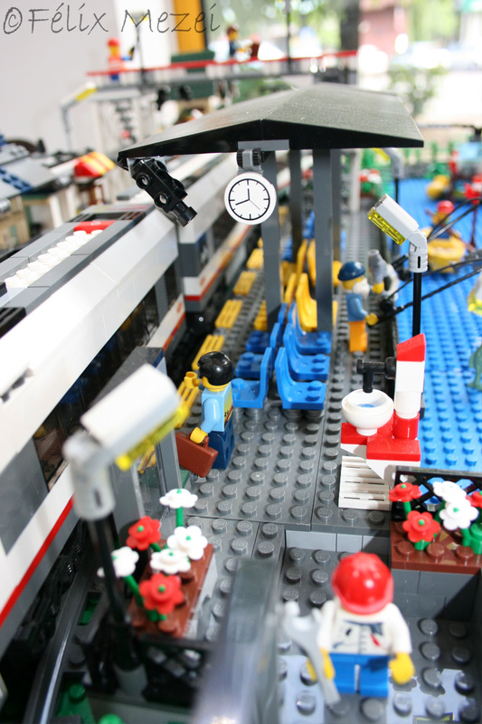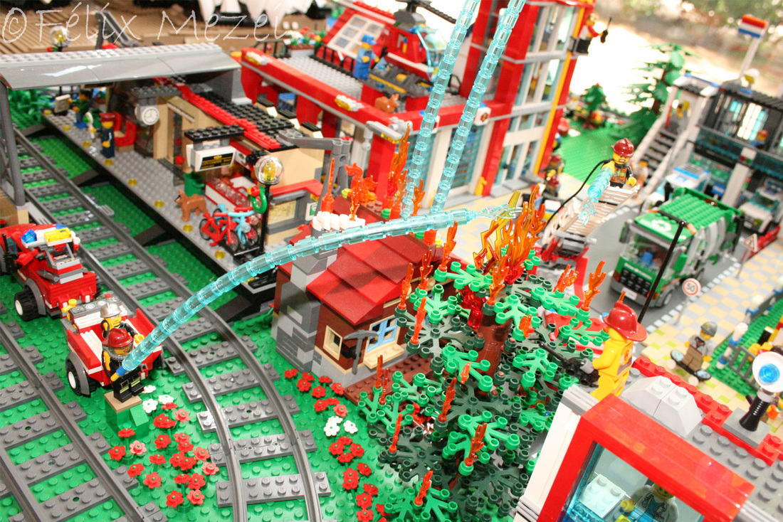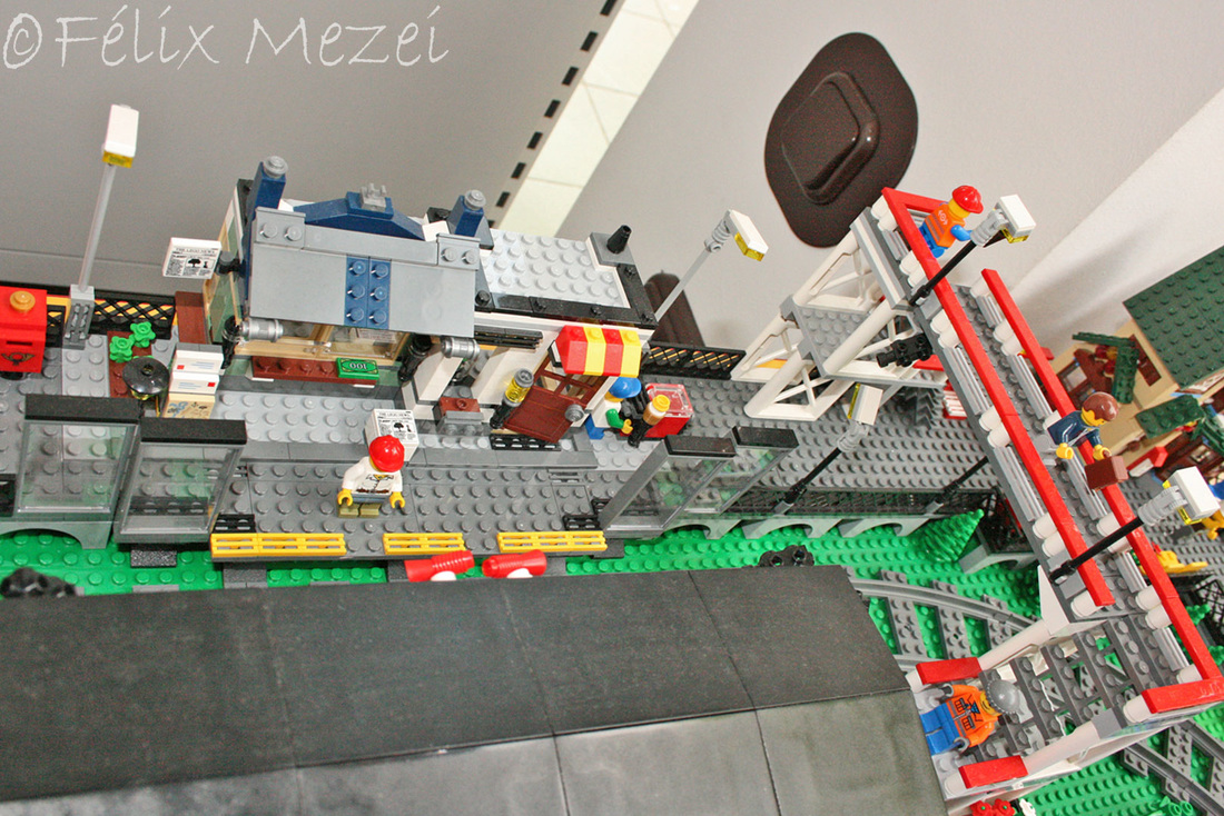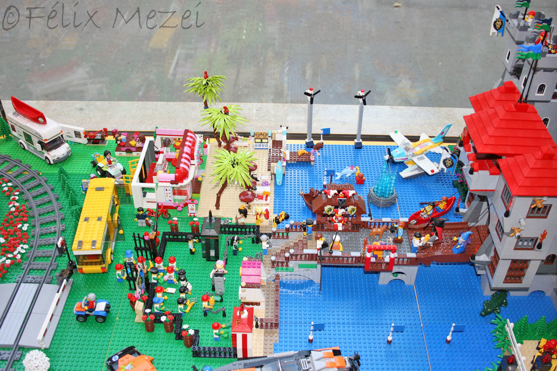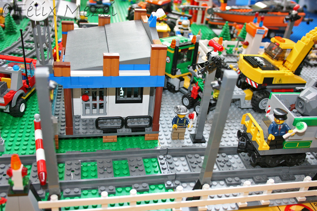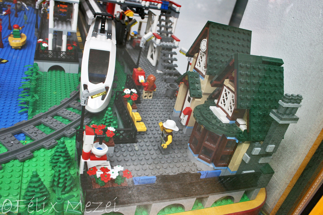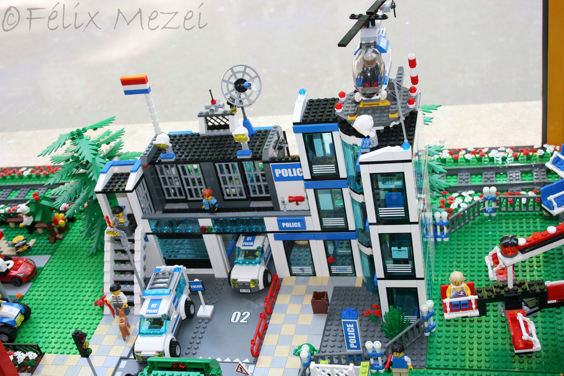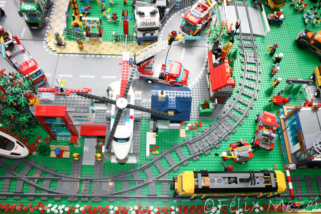 The Town comprises a personal creation of a train station, an official LEGO set train station, a city centre with the police station, fire department, hospital, four different houses, a fun-playground area and a campsite by the beach. All of these are crossed by a motorized bullet-train.