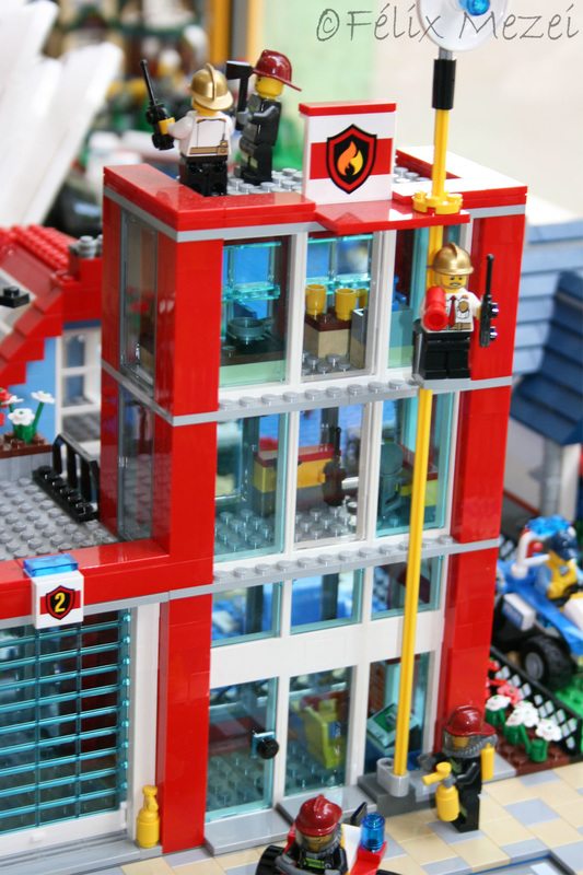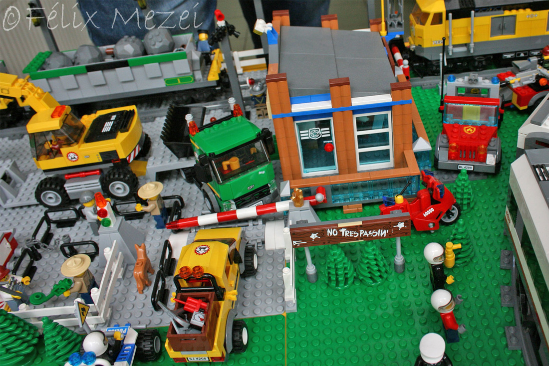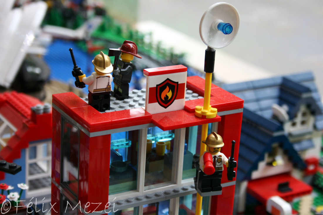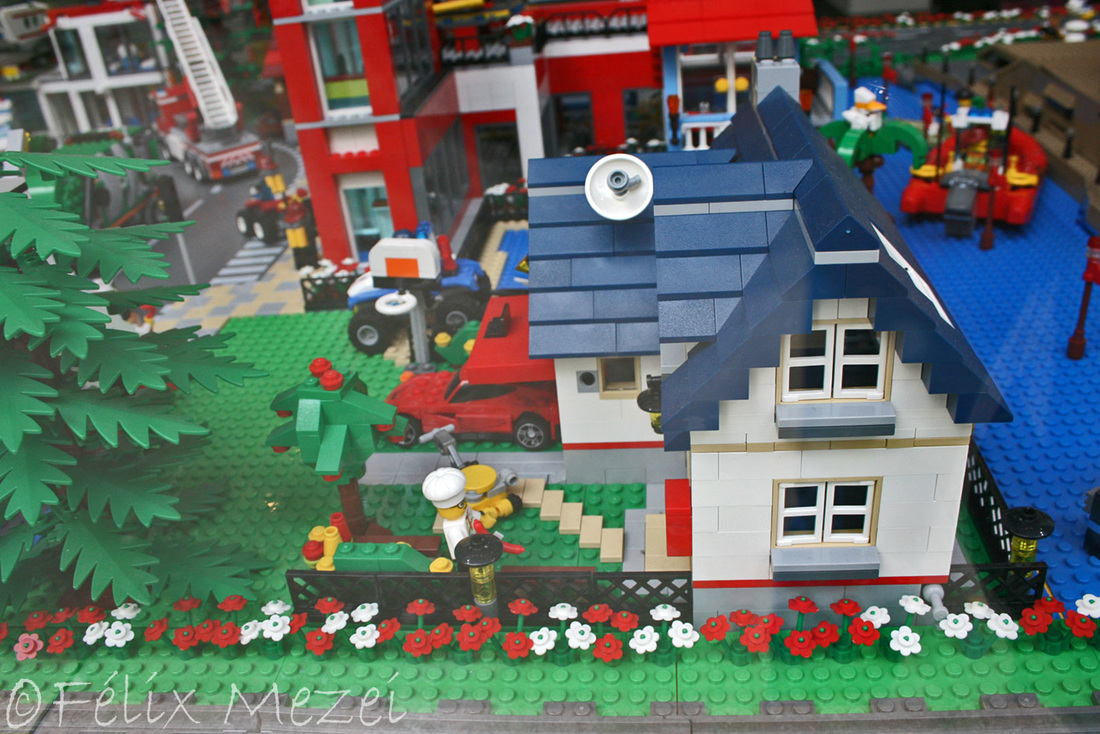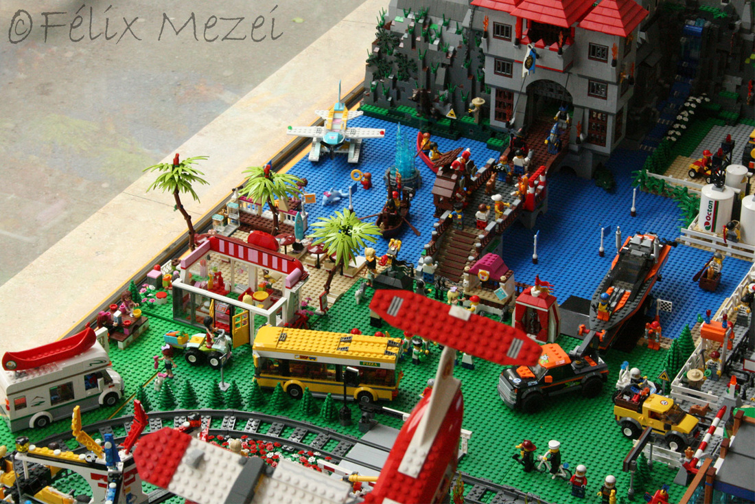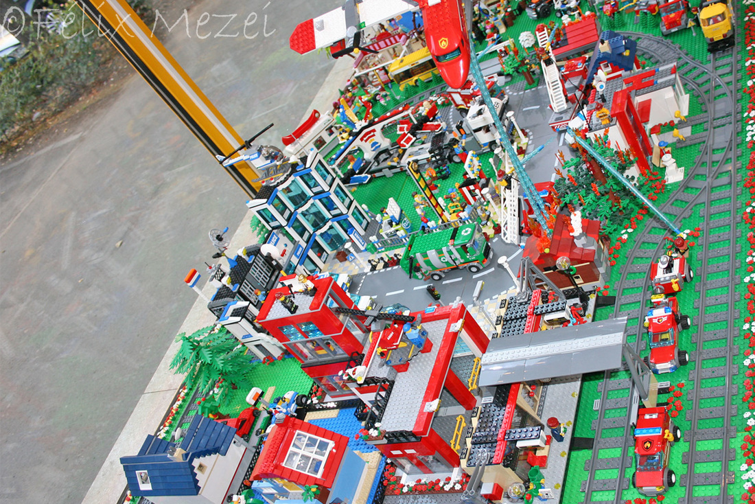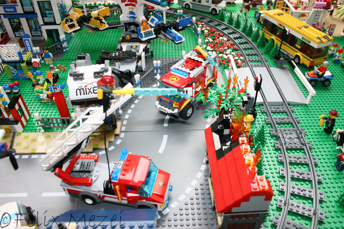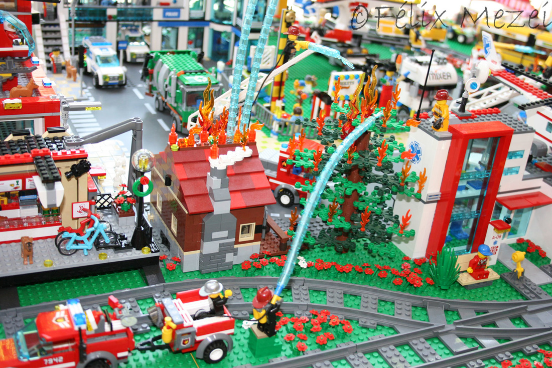 The Town comprises a personal creation of a train station, an official LEGO set train station, a city centre with the police station, fire department, hospital, four different houses, a fun-playground area and a campsite by the beach. All of these are crossed by a motorized bullet-train.