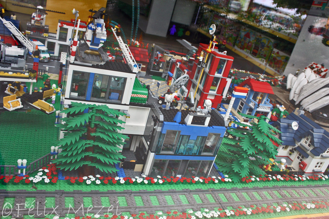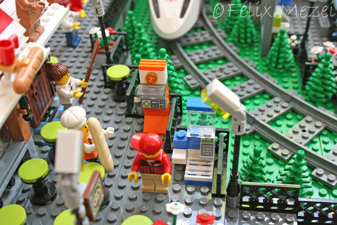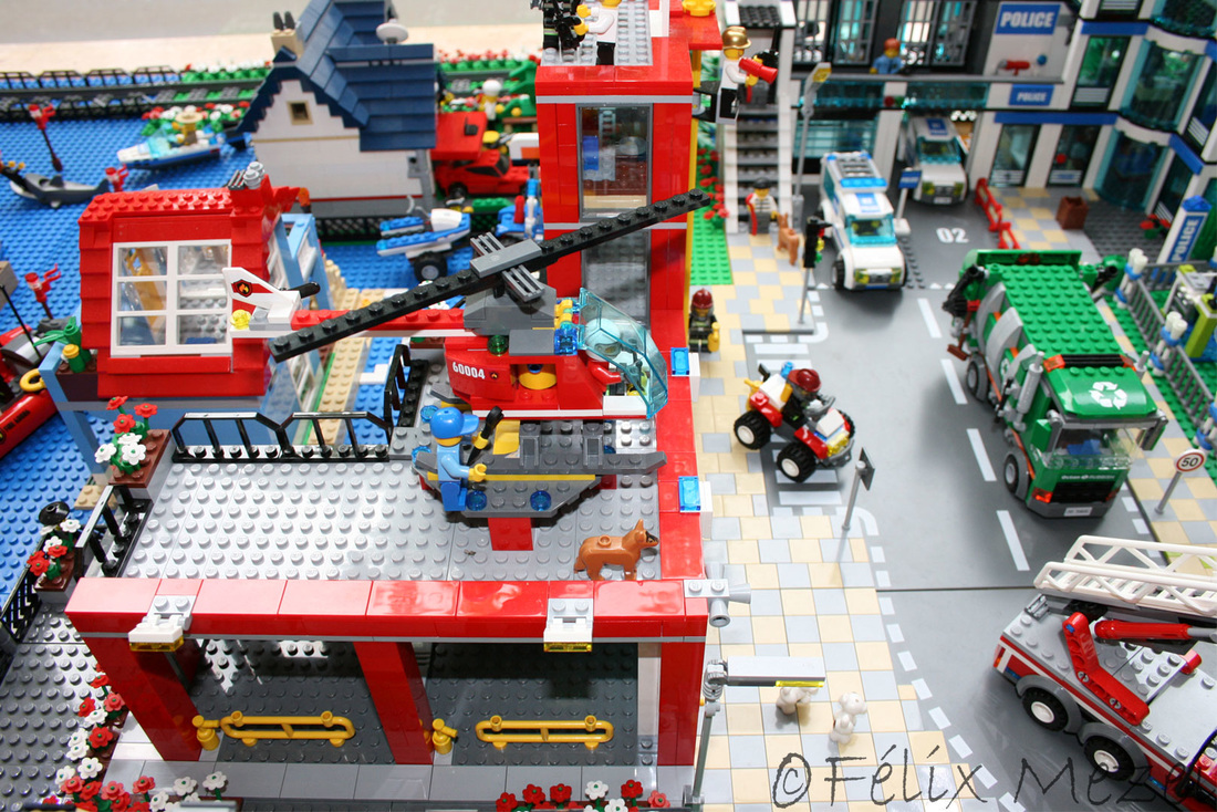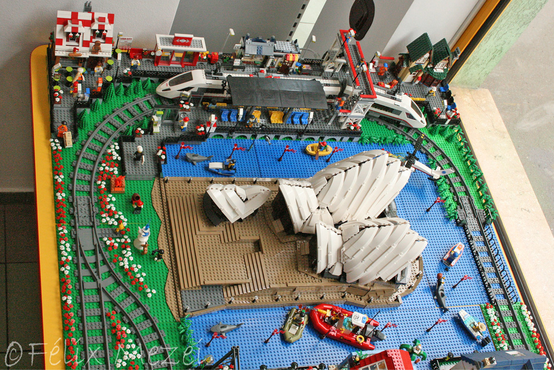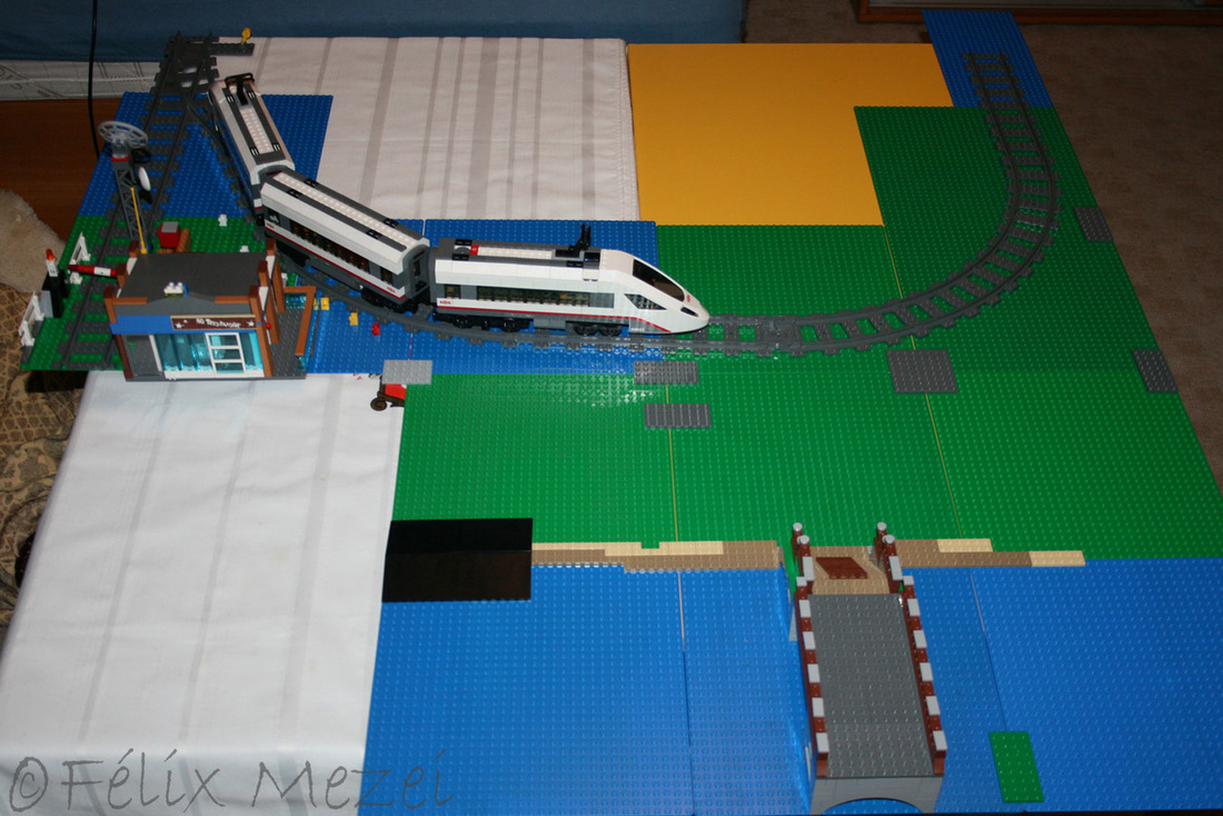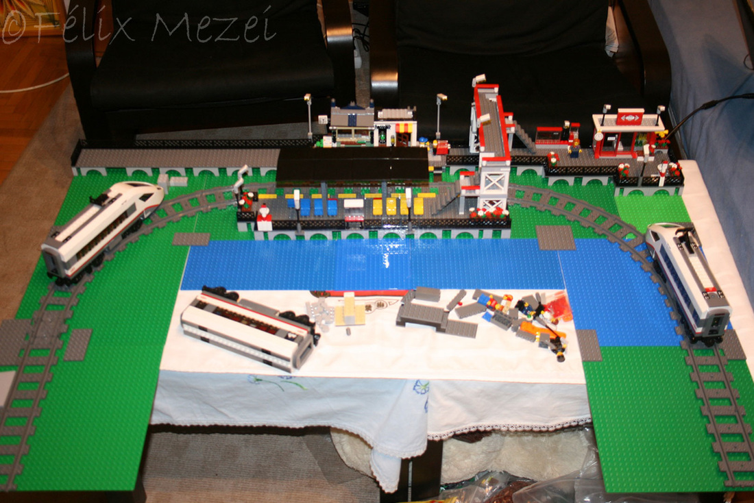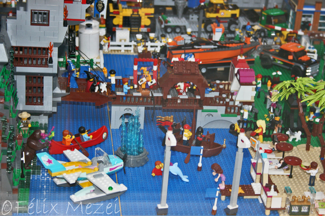 The Town comprises a personal creation of a train station, an official LEGO set train station, a city centre with the police station, fire department, hospital, four different houses, a fun-playground area and a campsite by the beach. All of these are crossed by a motorized bullet-train.