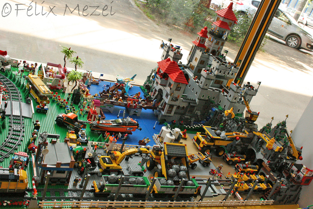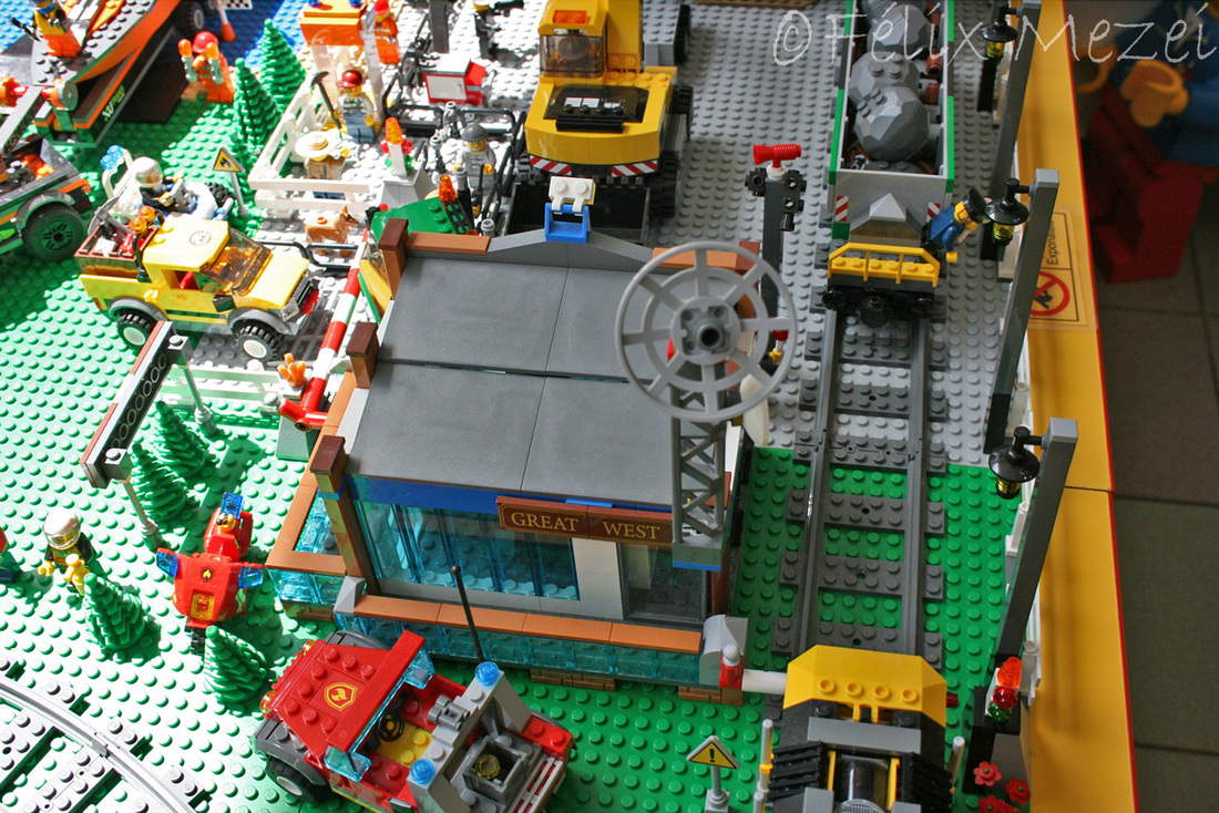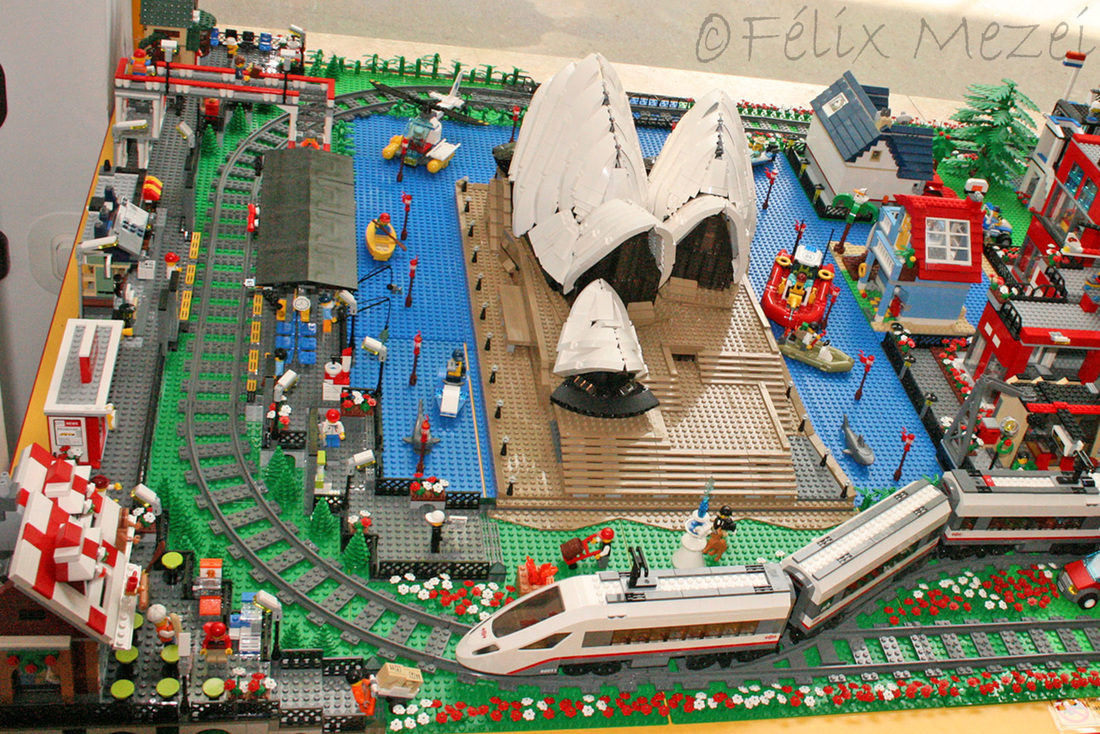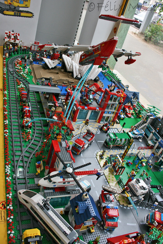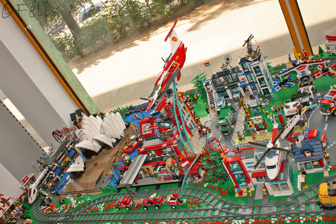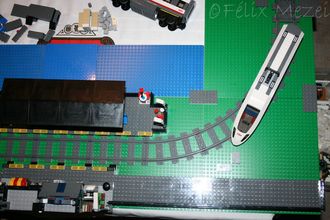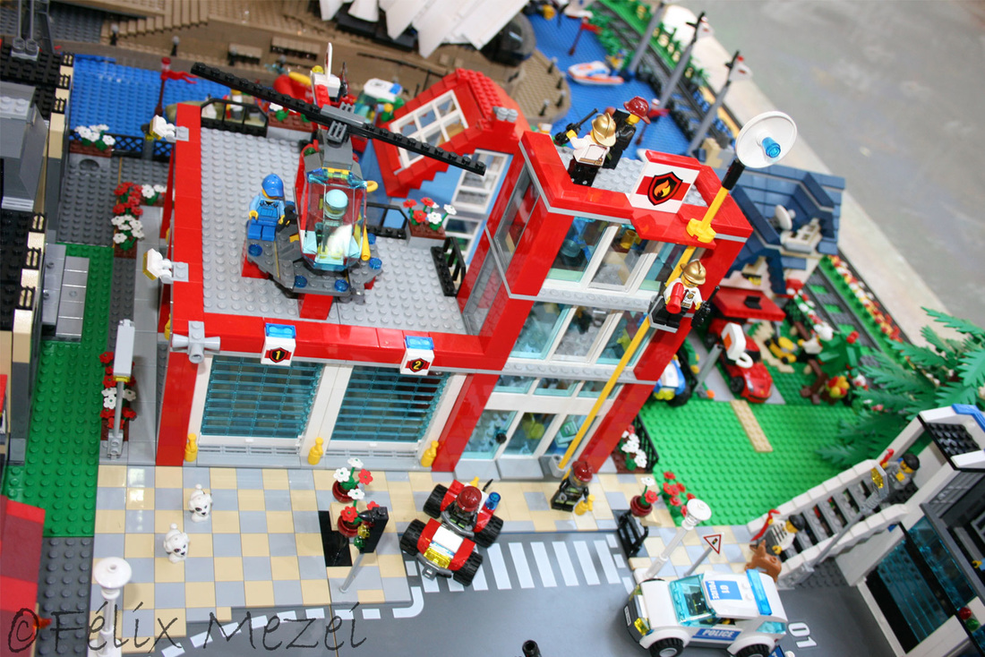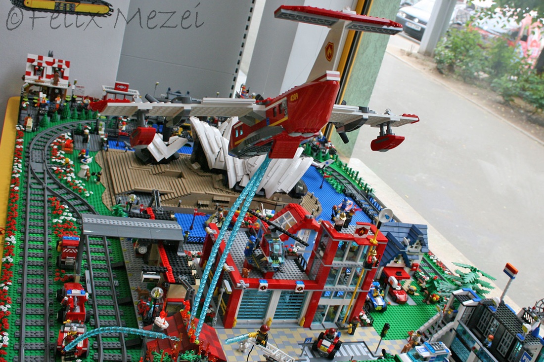 The Town comprises a personal creation of a train station, an official LEGO set train station, a city centre with the police station, fire department, hospital, four different houses, a fun-playground area and a campsite by the beach. All of these are crossed by a motorized bullet-train.