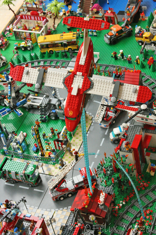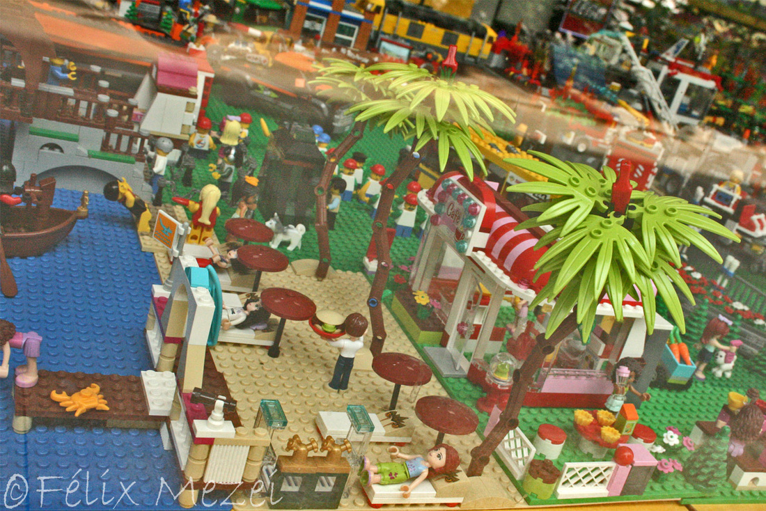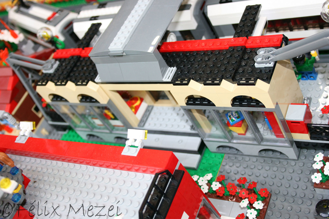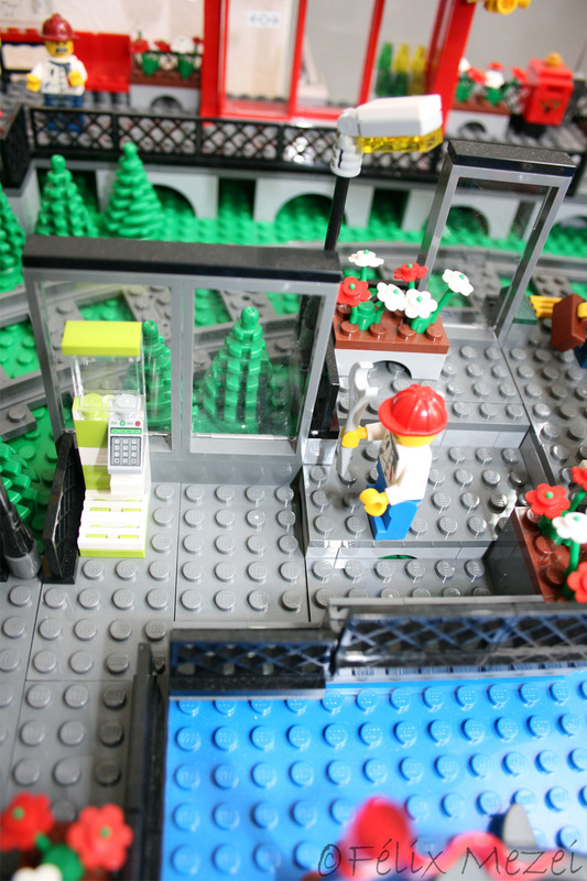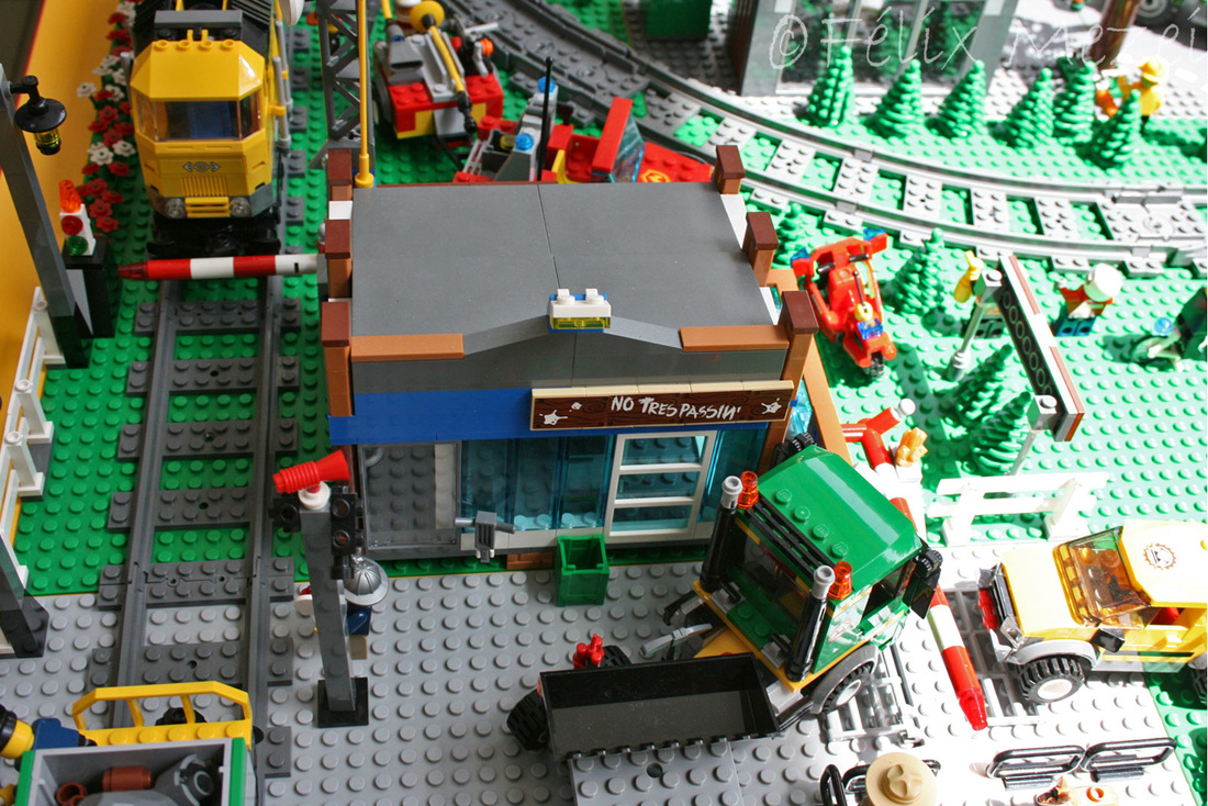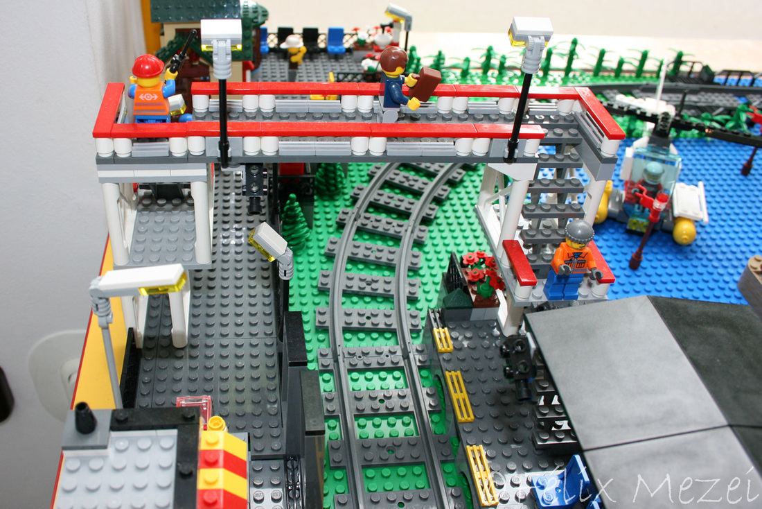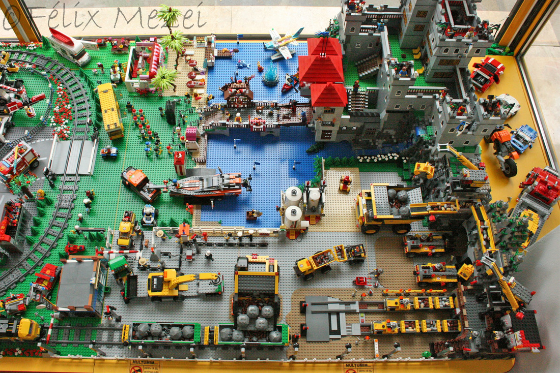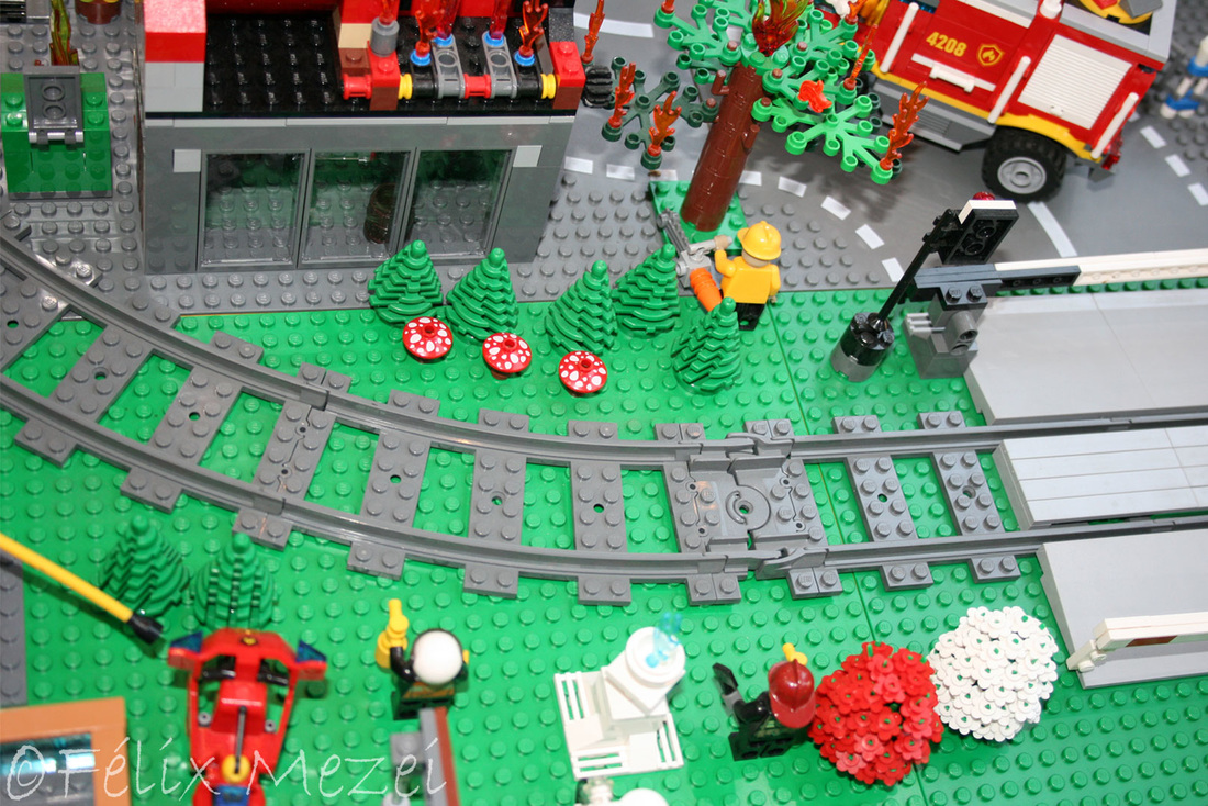 The Town comprises a personal creation of a train station, an official LEGO set train station, a city centre with the police station, fire department, hospital, four different houses, a fun-playground area and a campsite by the beach. All of these are crossed by a motorized bullet-train.