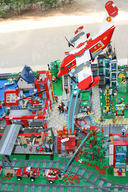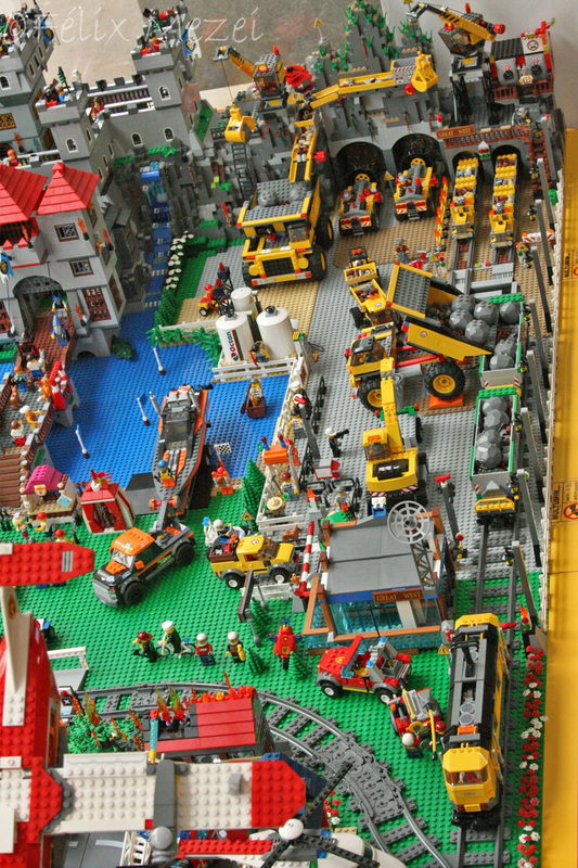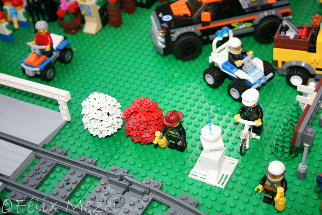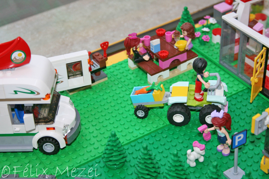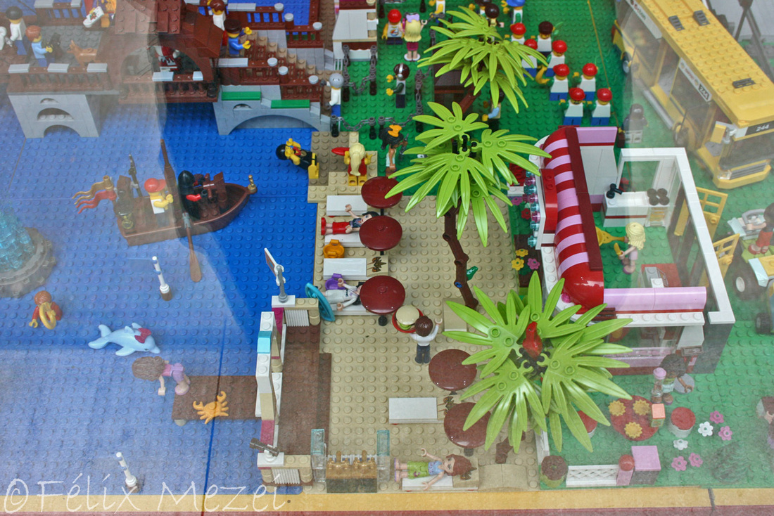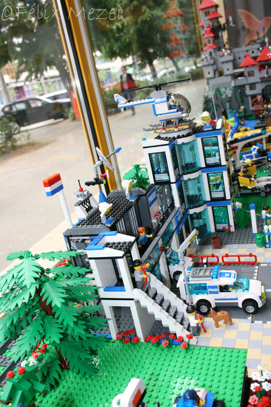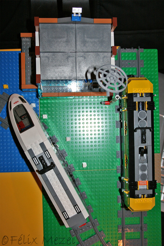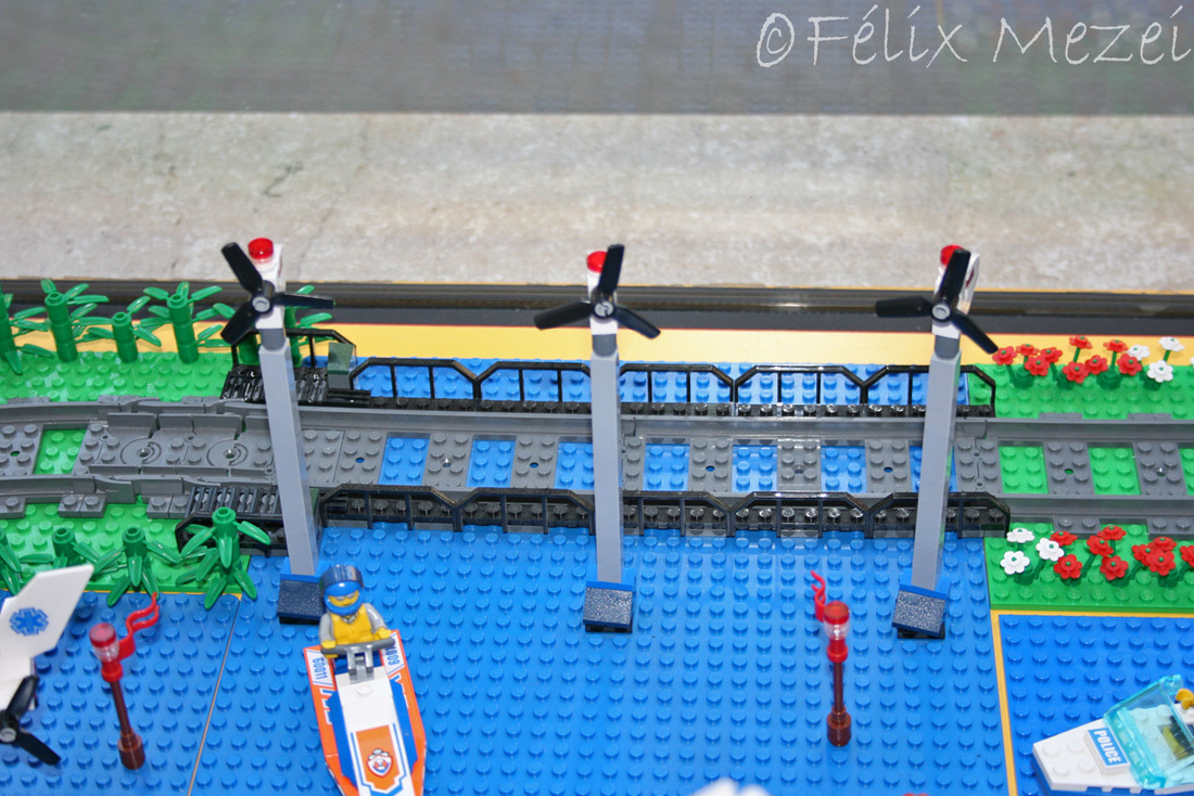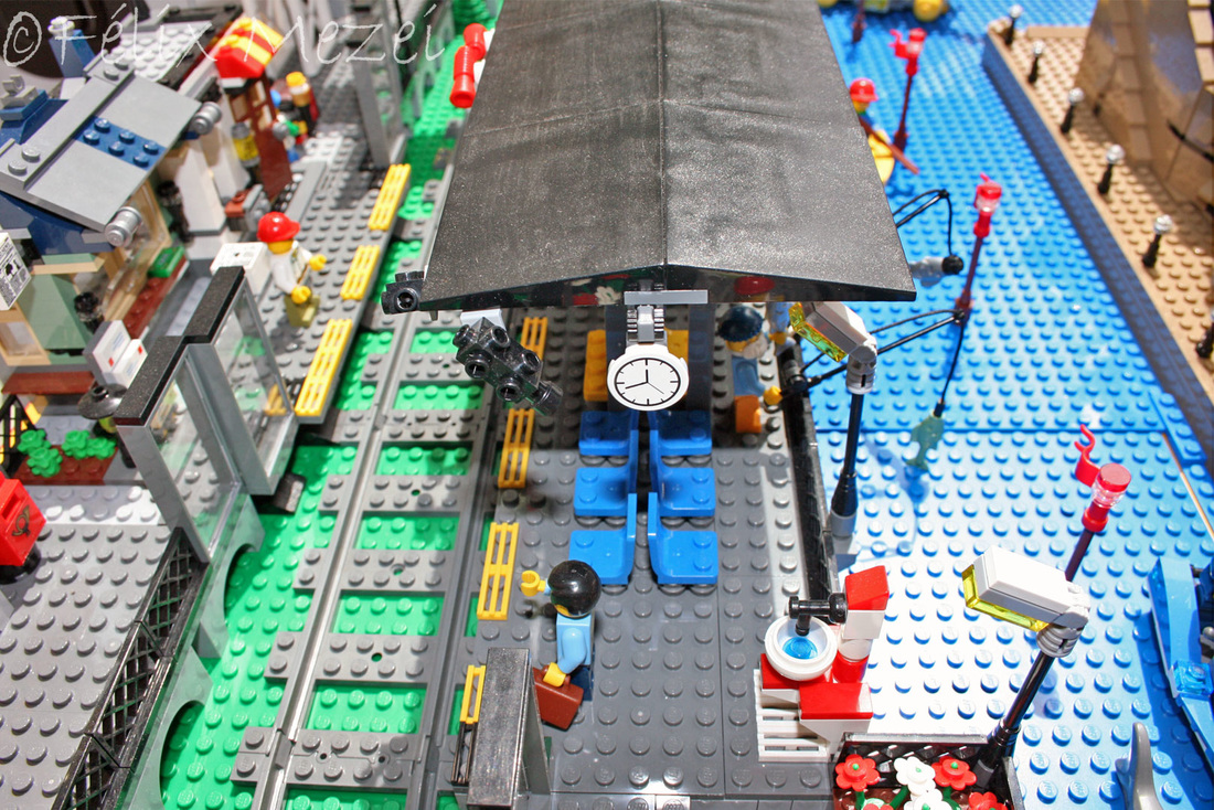 The Town comprises a personal creation of a train station, an official LEGO set train station, a city centre with the police station, fire department, hospital, four different houses, a fun-playground area and a campsite by the beach. All of these are crossed by a motorized bullet-train.