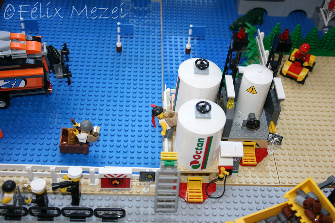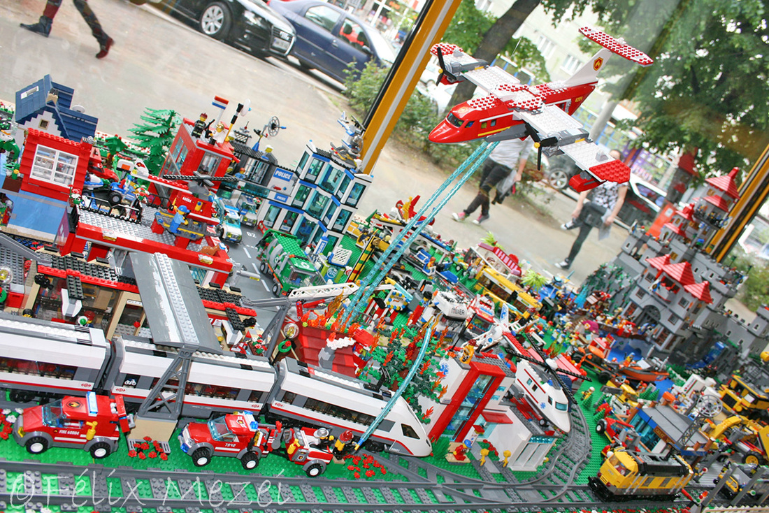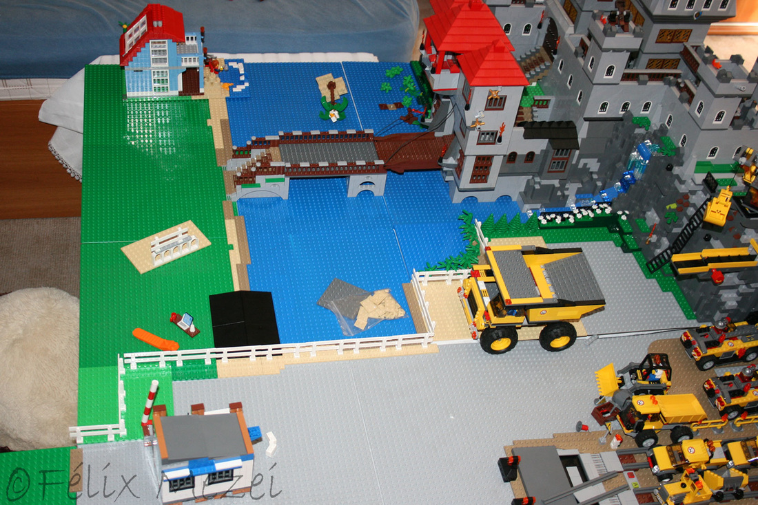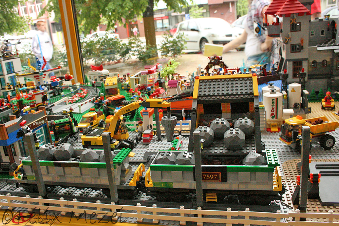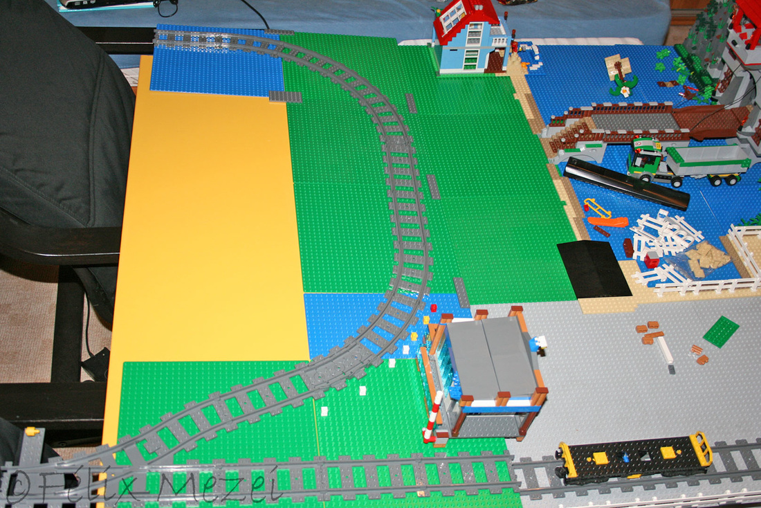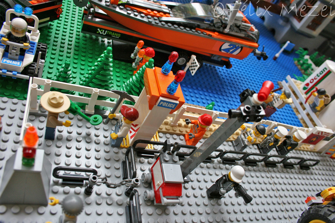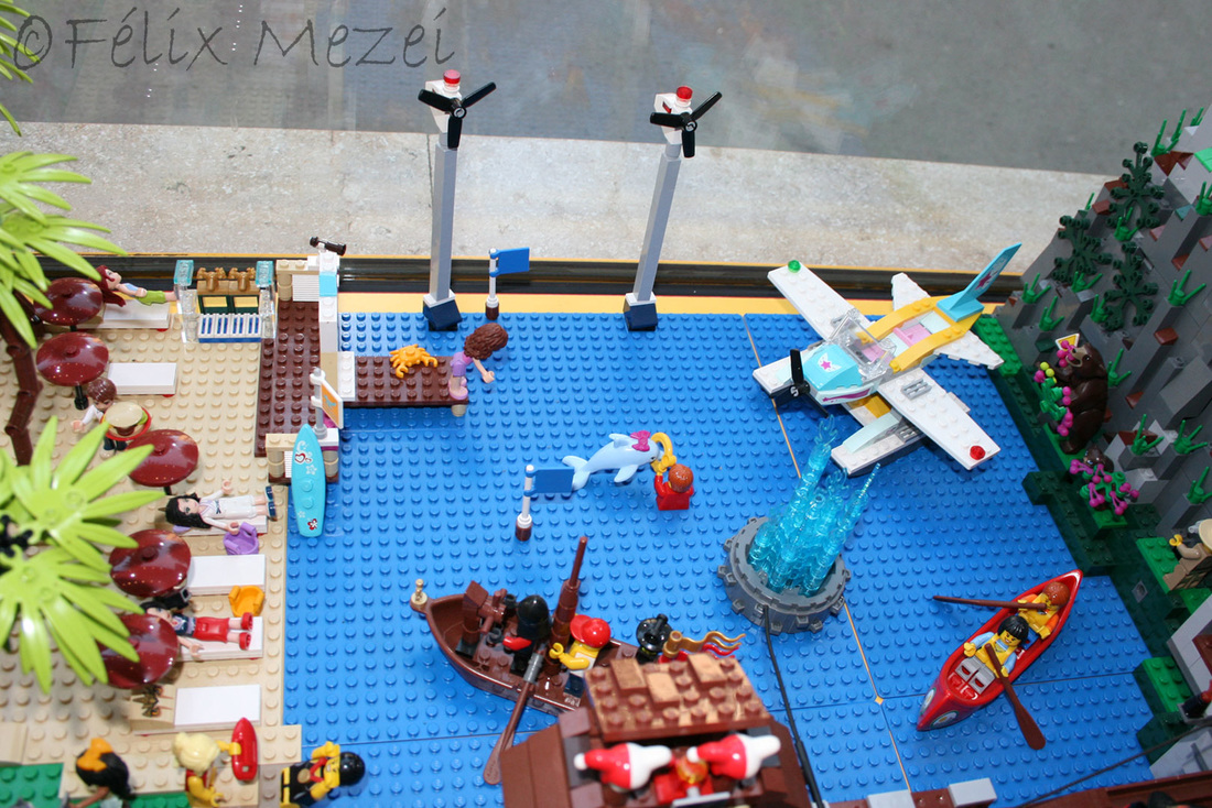 The Town comprises a personal creation of a train station, an official LEGO set train station, a city centre with the police station, fire department, hospital, four different houses, a fun-playground area and a campsite by the beach. All of these are crossed by a motorized bullet-train.