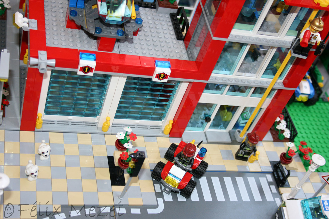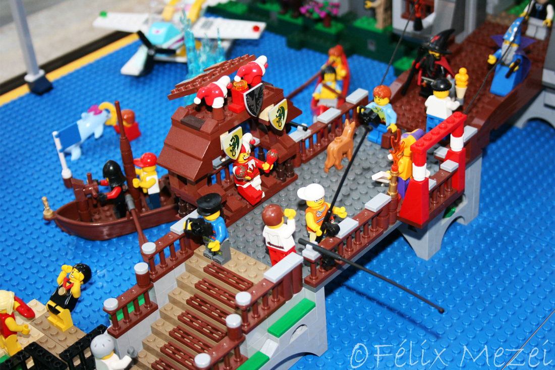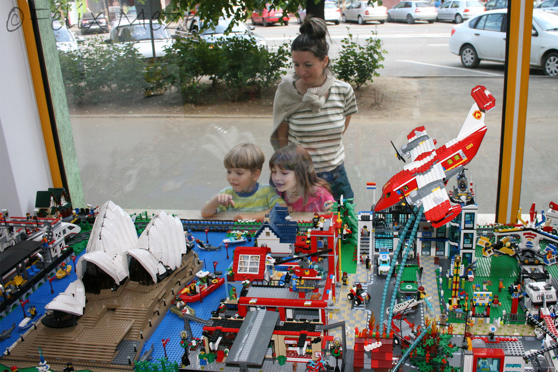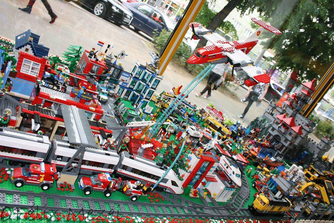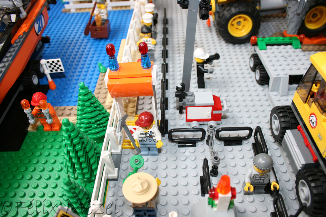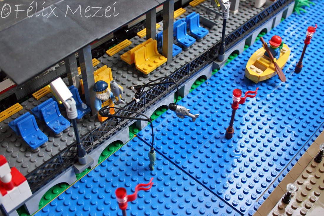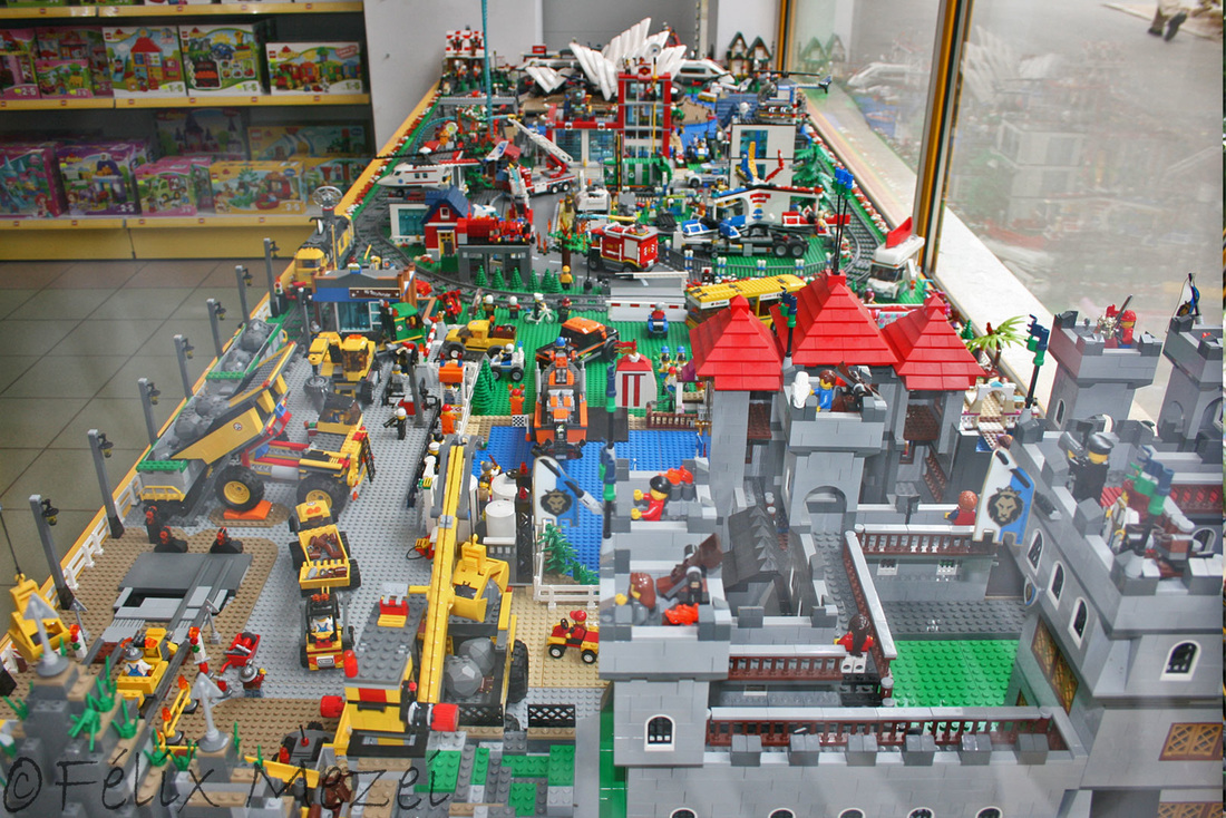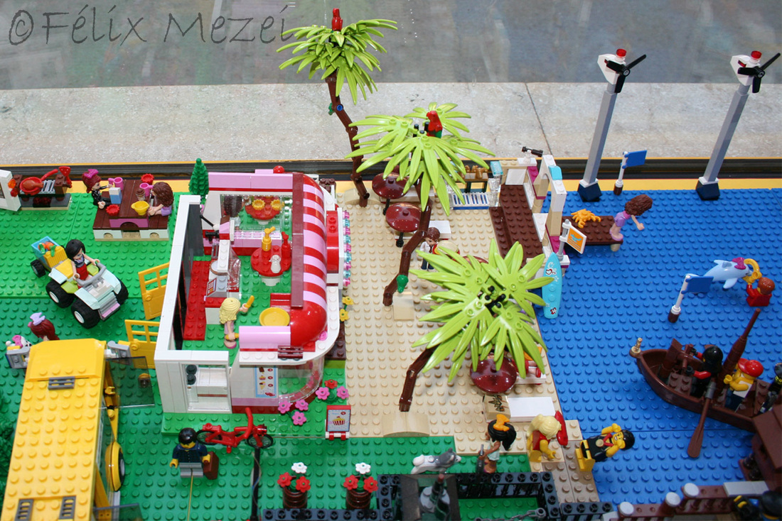 The Town comprises a personal creation of a train station, an official LEGO set train station, a city centre with the police station, fire department, hospital, four different houses, a fun-playground area and a campsite by the beach. All of these are crossed by a motorized bullet-train.