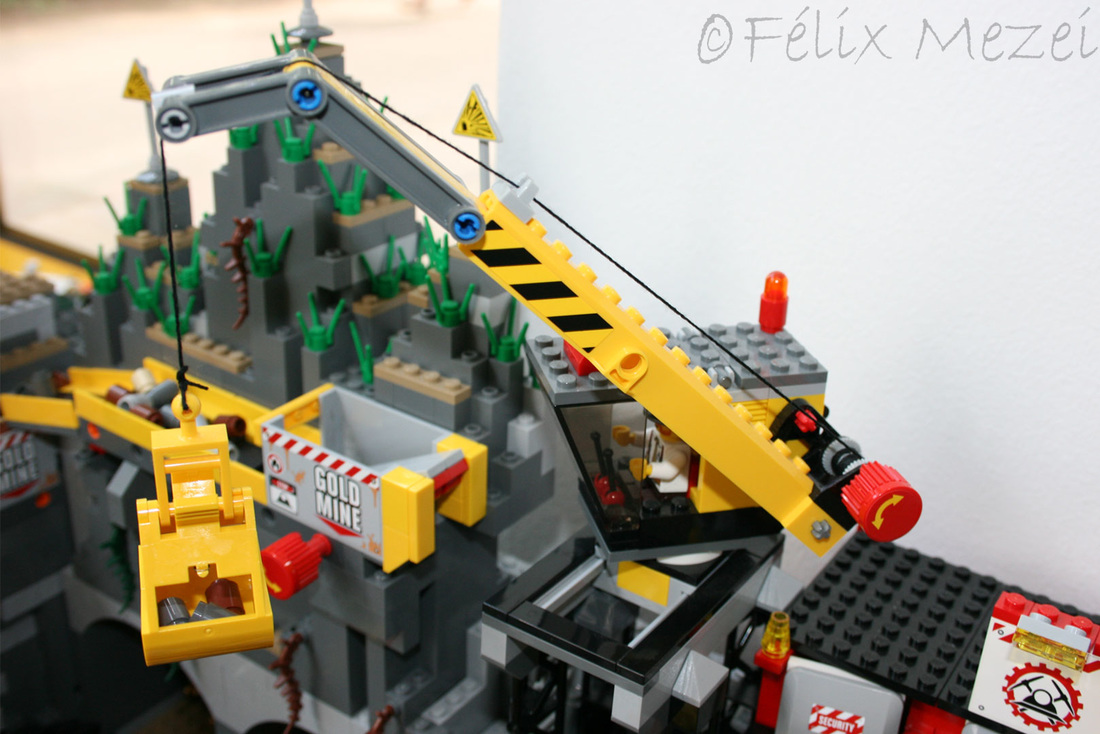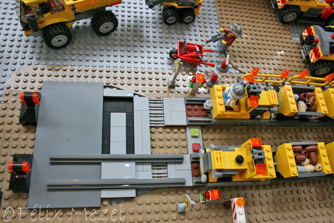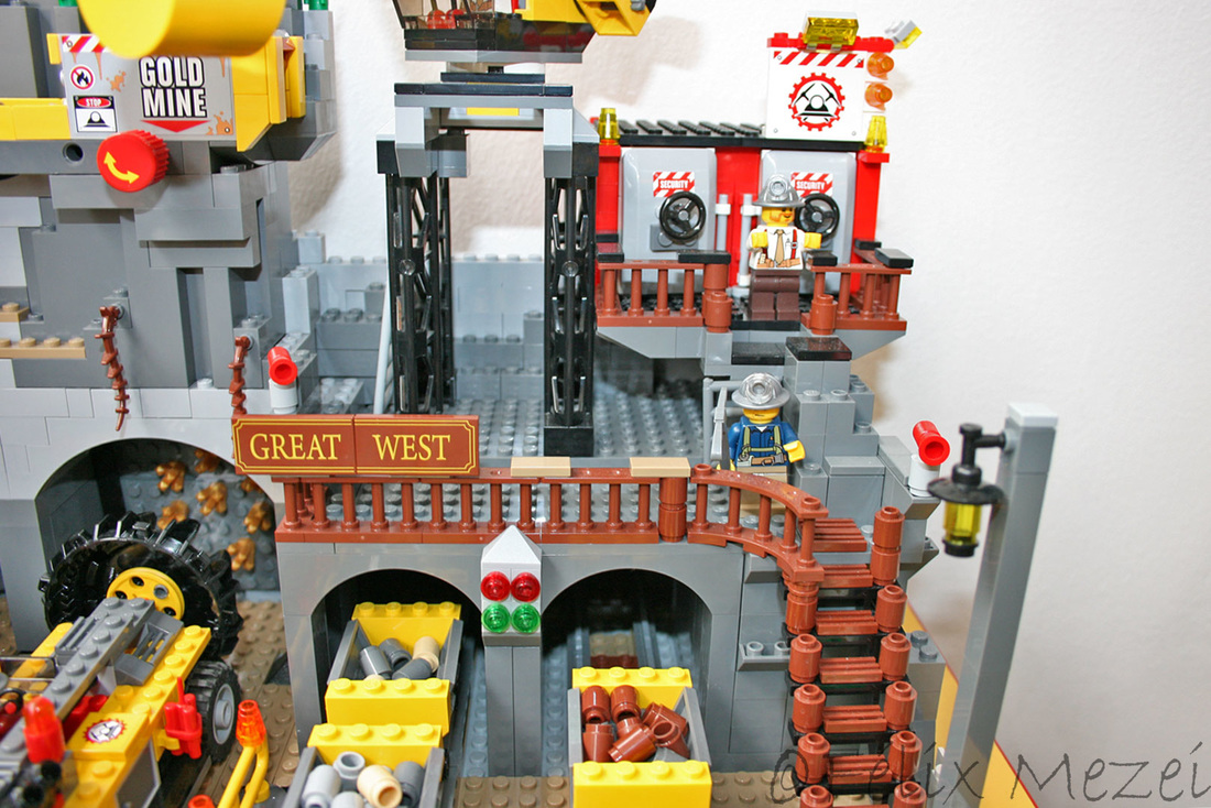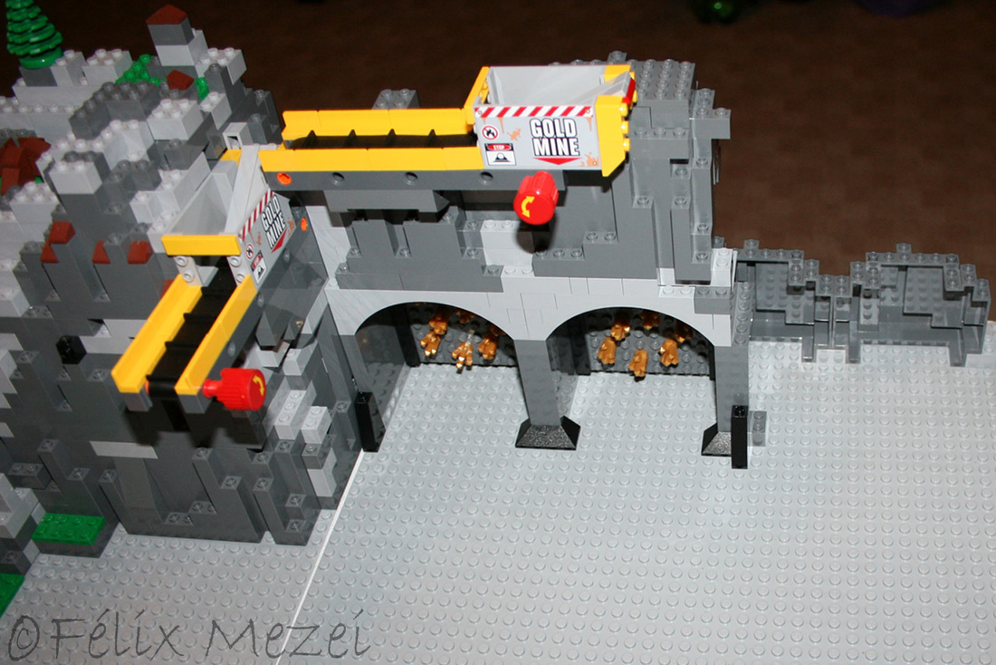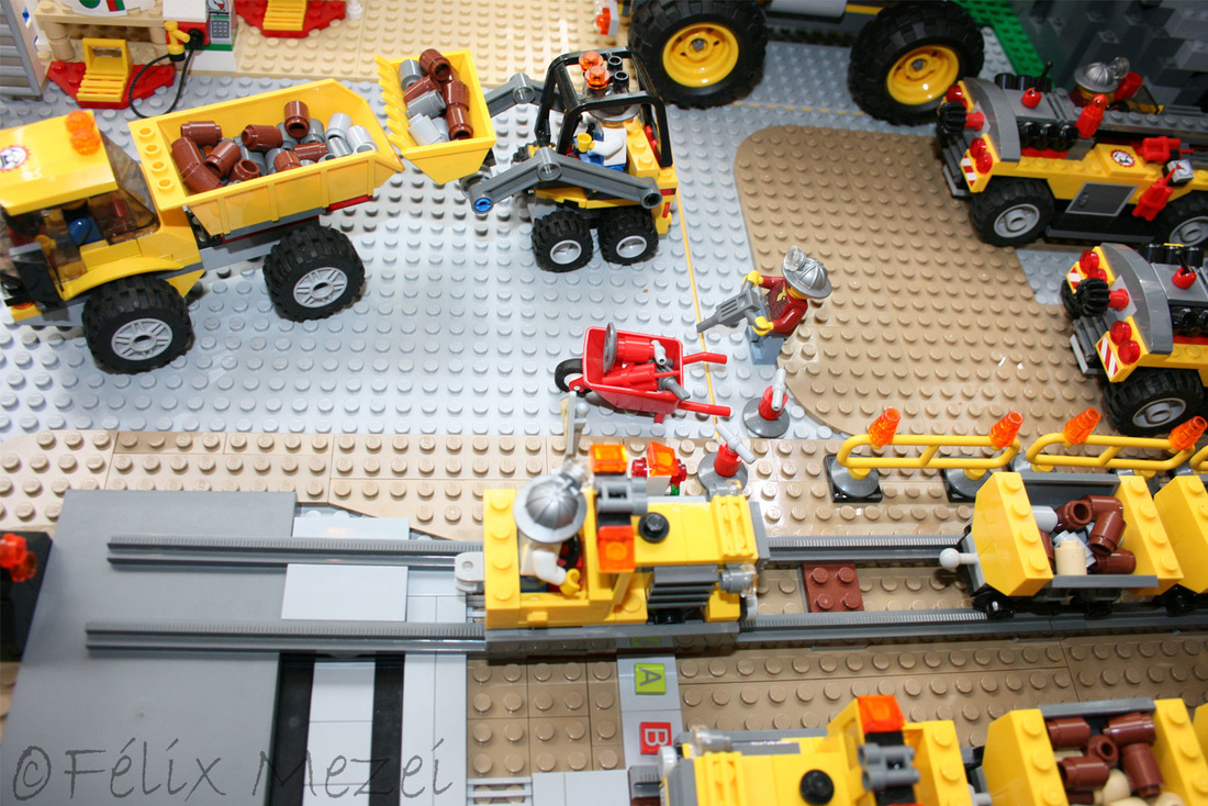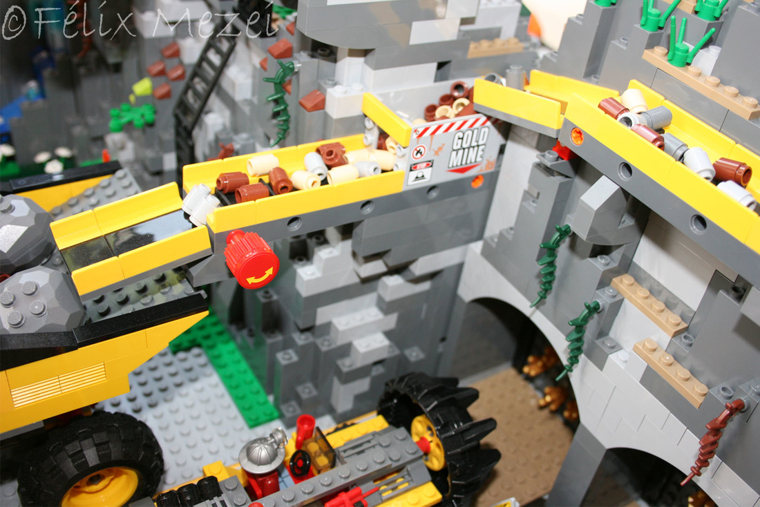 The Gold Mine is a personal creation, in which I used all sets of Lego City Subtheme “Mining” which appeared in 2012 most of which being coupled in the work. It includes a mountain with two boreholes, a desk with a safe for storing gold, two lines and two mine trains, a turntable for turning locomotives on both lines (link demo), 2 mega-trucks which transport ore, an area for storing fuel, a line with standard gauge rail wagons for transporting ore, an area for washing cars, an area to check miners shifts with a metal detector, a gateway to the courtyard of the mine with a head guard, a car control and railroad barriers.