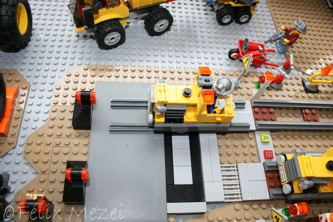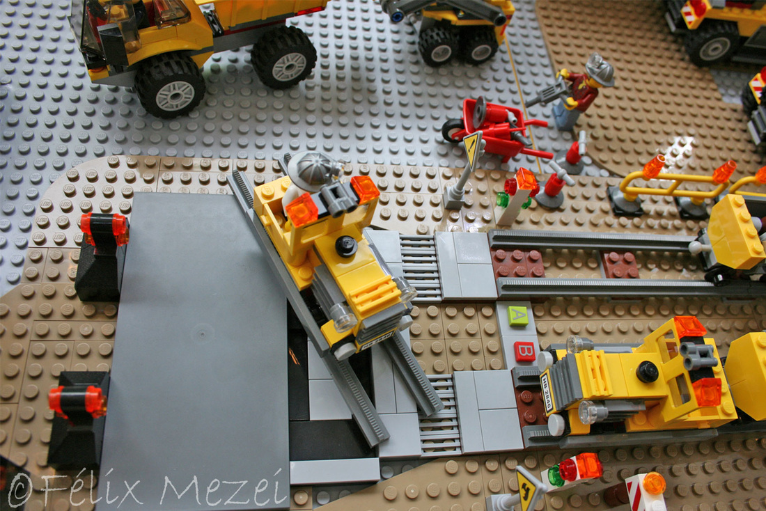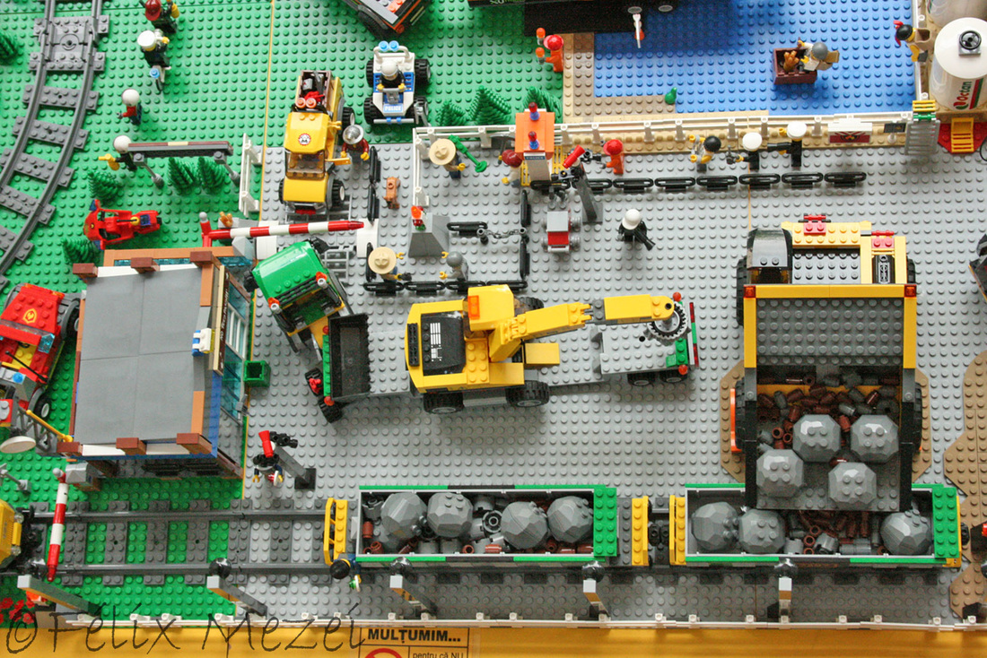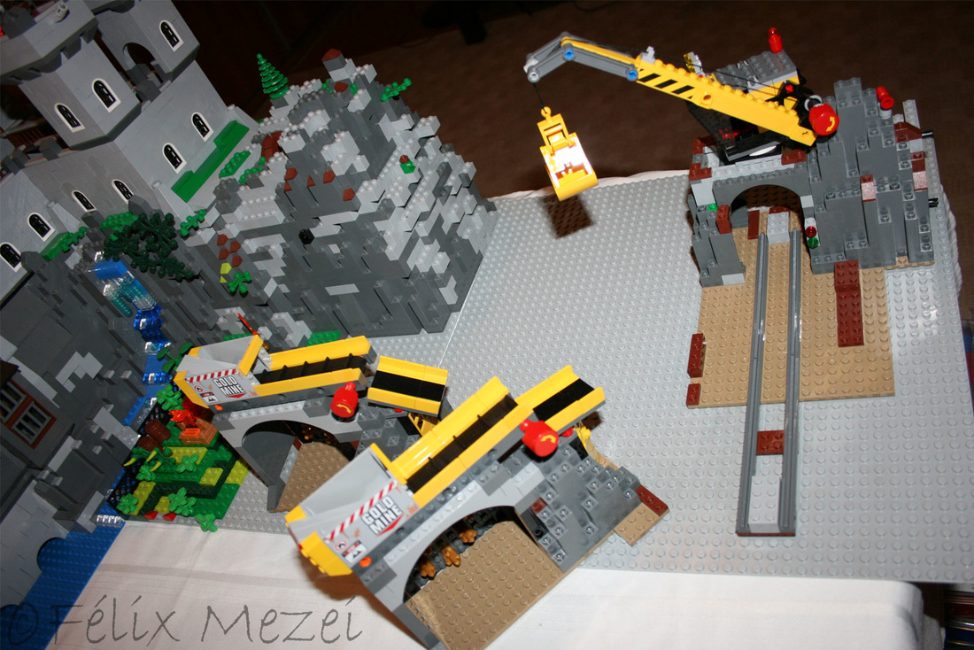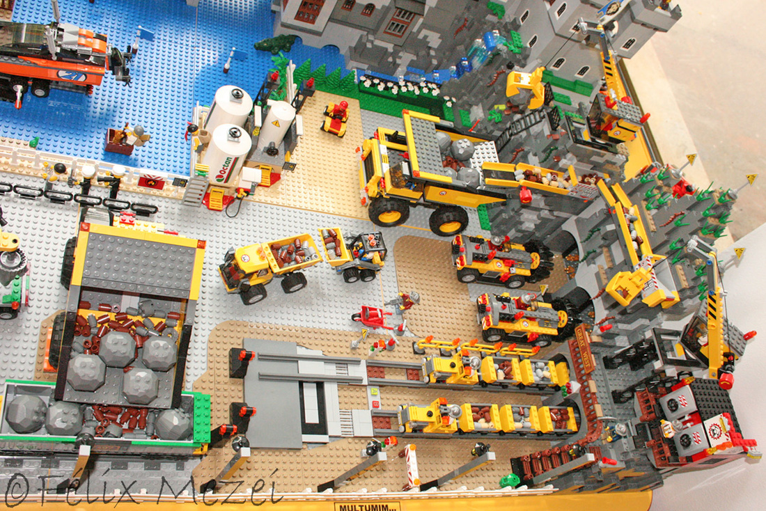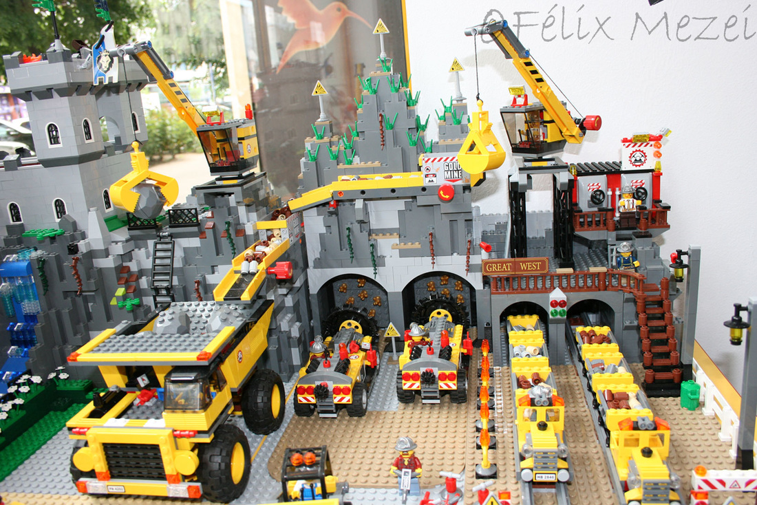 The Gold Mine is a personal creation, in which I used all sets of Lego City Subtheme “Mining” which appeared in 2012 most of which being coupled in the work. It includes a mountain with two boreholes, a desk with a safe for storing gold, two lines and two mine trains, a turntable for turning locomotives on both lines (link demo), 2 mega-trucks which transport ore, an area for storing fuel, a line with standard gauge rail wagons for transporting ore, an area for washing cars, an area to check miners shifts with a metal detector, a gateway to the courtyard of the mine with a head guard, a car control and railroad barriers.